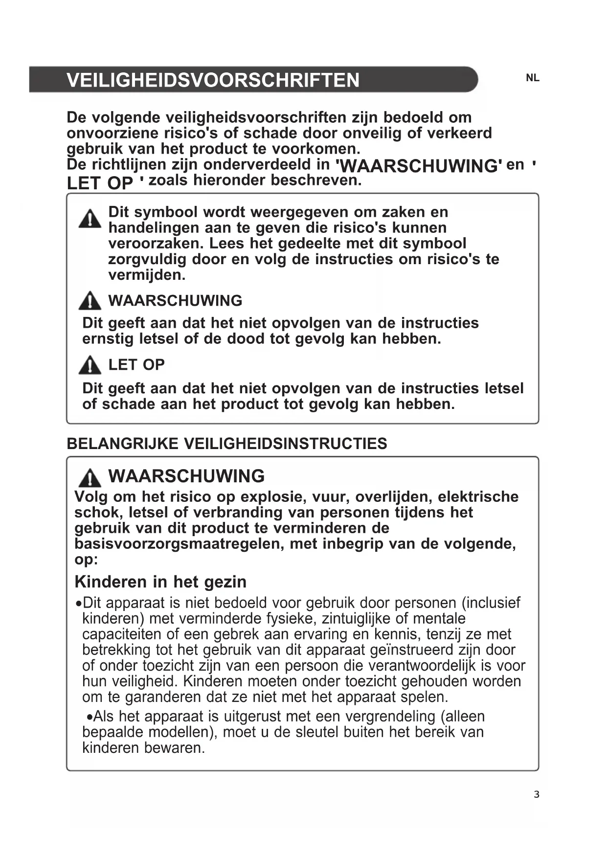zoals hieronder beschreven. Dit symbool wordt weergegeven om zaken en handelingen aan te geven die risico's kunnen veroorzaken. Lees het gedeelte met dit symbool zorgvuldig door en volg de instructies om risico's te vermijden.WAARSCHUWINGDit geeft aan dat het niet opvolgen van de instructies ernstig letsel of de dood tot gevolg kan hebben.LET OPDit geeft aan dat het niet opvolgen van de instructies letsel of schade aan het product tot gevolg kan hebben. BELANGRIJKE VEILIGHEIDSINSTRUCTIES WAARSCHUWING Volg om het risico op explosie, vuur, overlijden, elektrische schok, letsel of verbranding van personen tijdens het gebruik van dit product te verminderen de basisvoorzorgsmaatregelen, met inbegrip van de volgende, op: Kinderen in het gezin