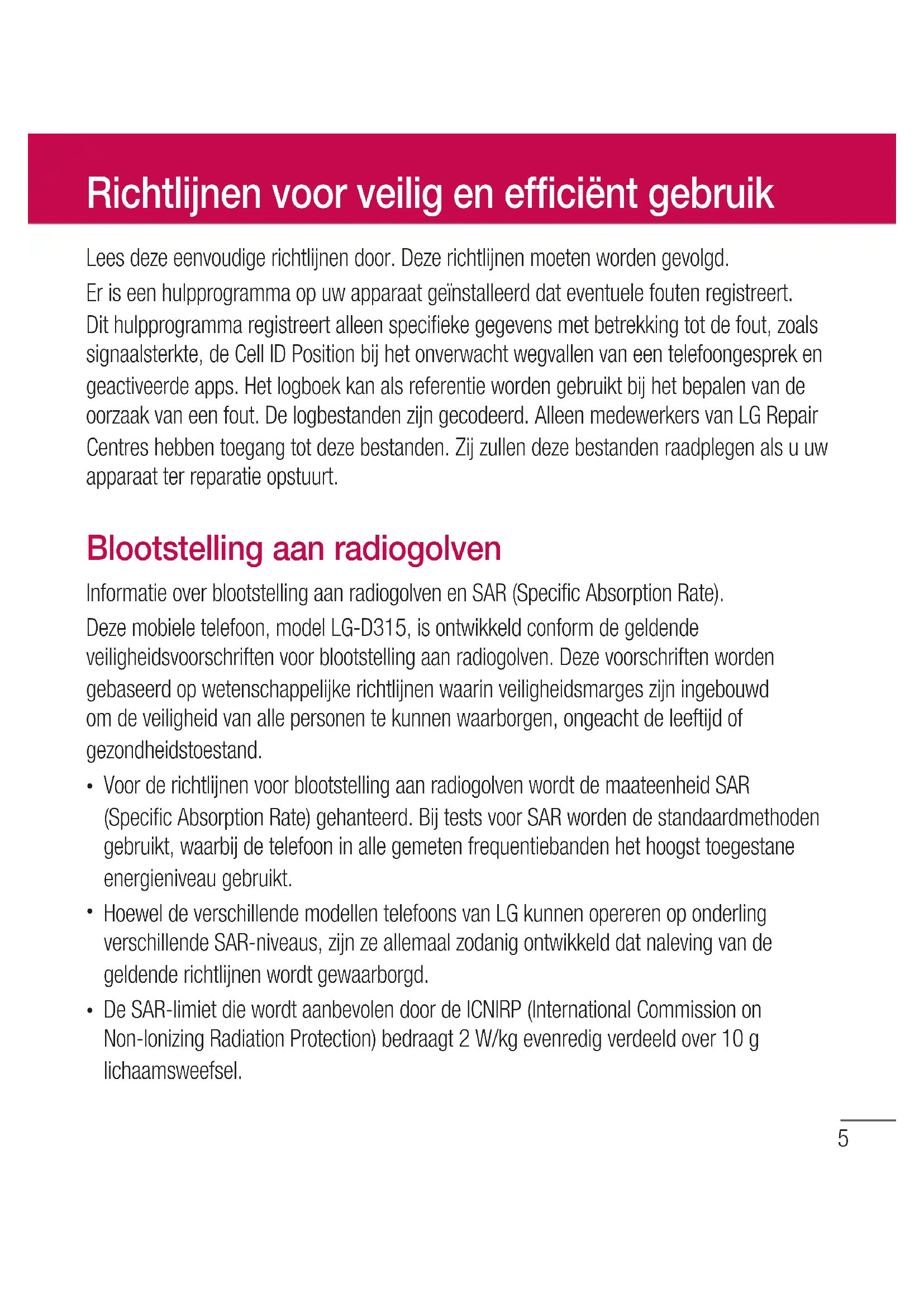 HoeweldeverschillendemodellentelefoonsvanLGkunnenopererenoponderling verschillendeSAR-niveaus,zijnzeallemaalzodanigontwikkelddatnalevingvande geldenderichtlijnenwordtgewaarborgd.