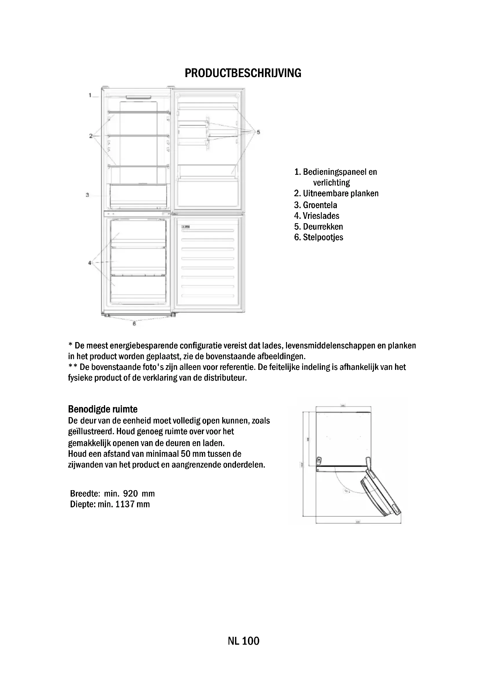 - De meest energiebesparende configuratie vereist dat lades, levensmiddelenschappen en planken in het product worden geplaatst, zie de bovenstaande afbeeldingen. ** De bovenstaande foto's zijn alleen voor referentie. De feitelijke indeling is afhankelijk van het fysieke product of de verklaring van de distributeur. Benodigde ruimte De deur van de eenheid moet volledig open kunnen, zoals geïllustreerd. Houd genoeg ruimte over voor het gemakkelijk openen van de deuren en laden. Houd een afstand van minimaal 50 mm tussen de zijwanden van het product en aangrenzende onderdelen. Breedte: min. 920 mm Diepte: min. 1137 mmNL 101 GEBRUIK ➀ AAN/UIT-toets, gebruikt om het apparaat aan/uit te zetten. ➁ SET-toets, wordt gebruikt om de koelkasttemperatuur te selecteren of de speciale functies. ➂ Pictogram voor superkoelen, laat zien of de functie is geactiveerd. ➃ Temperatuurniveaus, geven aan welke temperatuur geselecteerd is. Gebruik