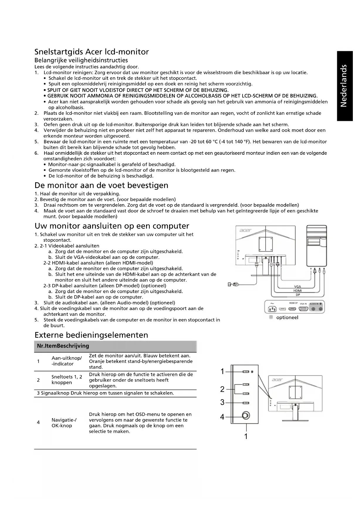 Num freq aggiorn Lingua Intervallo OSD Trasparenza Blocco OSD Input Origine auto Schermo intero Assegnazione tasti DDC/CI Attiva/Spento Liv nero HDMI Mod Avvio rapido Informazioni sul display Ripristina tutto Uscita Le specifiche variano a seconda della regione e/o del modello.Nederlands Snelstartgids Acer lcd-monitor Belangrijke veiligheidsinstructies Lees de volgende instructies aandachtig door.