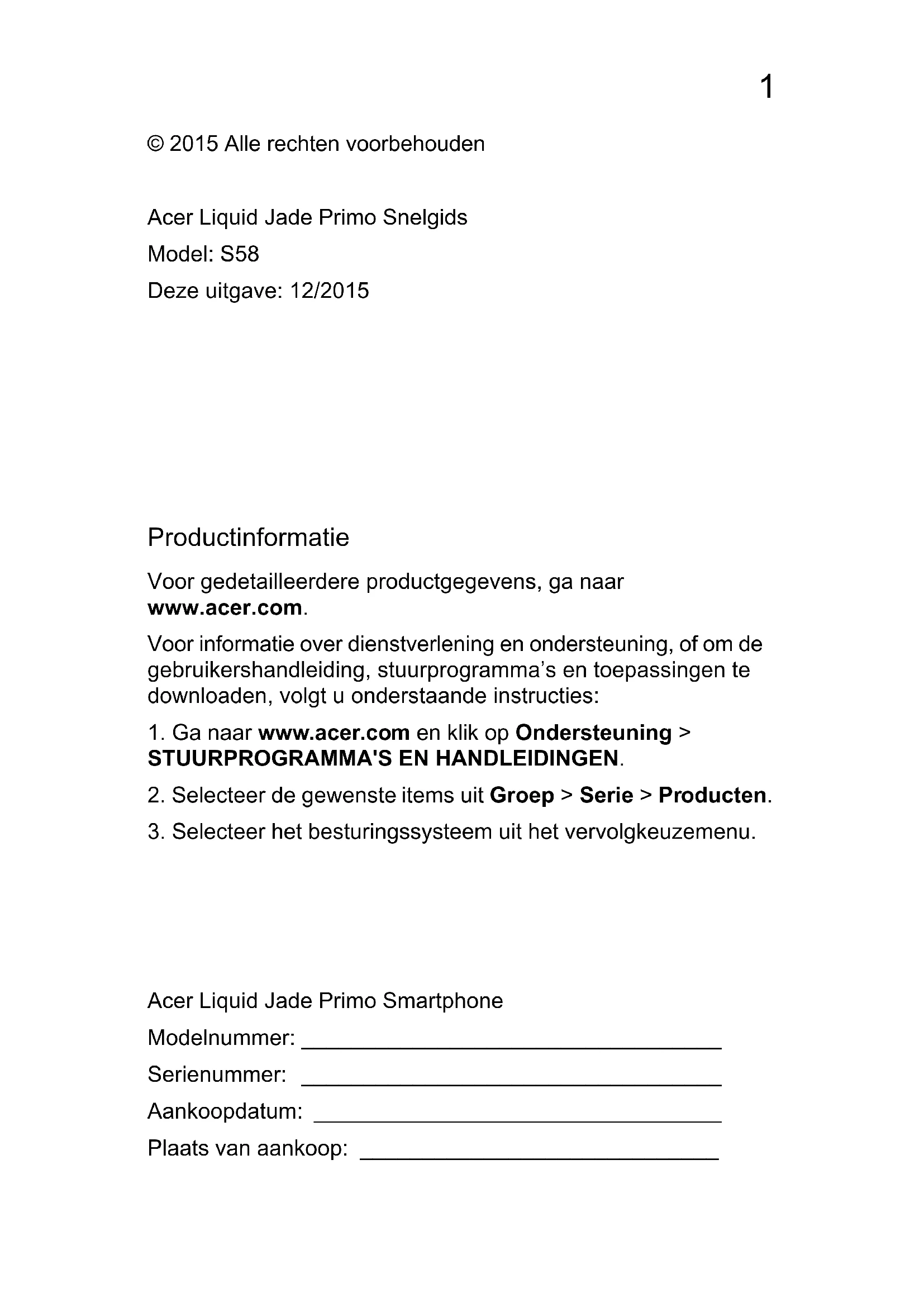 Nano SIM 2 Nano SIM 1 of microSD microSDCard SIM16 Nederlands De telefoon opladen U dient de smartphone voor het eerste gebruik ten minste acht uur op te laden. Daarna kunt u de batterij opladen zodra dit nodig is. Sluit de adapterkabel aan op de micro-usb-aansluiting van de smartphone. Steek de stroomadapter in een stopcontact en laad het toestel op. Het is normaal dat de telefoon warm wordt tijdens het opladen of tijdens een langdurig gebruik. Alle telefoons worden getest voordat ze worden uitgegeven.7 Nederlands De telefoon opnieuw instellen en opnieuw opstarten Open Instellingen in de lijst Apps en tik op Systeem > Over. Tik op Fabrieksinstellingen en tik tweemaal op Ja om de telefoon te resetten. Wanneer de telefoon niet meer reageert, houdt u gedurende 15 seconden de aan/uit-knop ingedrukt om de telefoon uit te schakelen. Houd de aan/uit-knop langer dan 15 seconden ingedrukt om opnieuw op te starten. Opmerking: Voer deze handeling niet uit wanneer de telefoon oplaadt. Verwijder eerst de oplader.1 English Información del producto Para obtener información detallada sobre el producto, vaya a www.acer.com. Para obtener información sobre servicio y asistencia o para descargar la guía del usuario, controladores y aplicaciones, siga estas instrucciones: