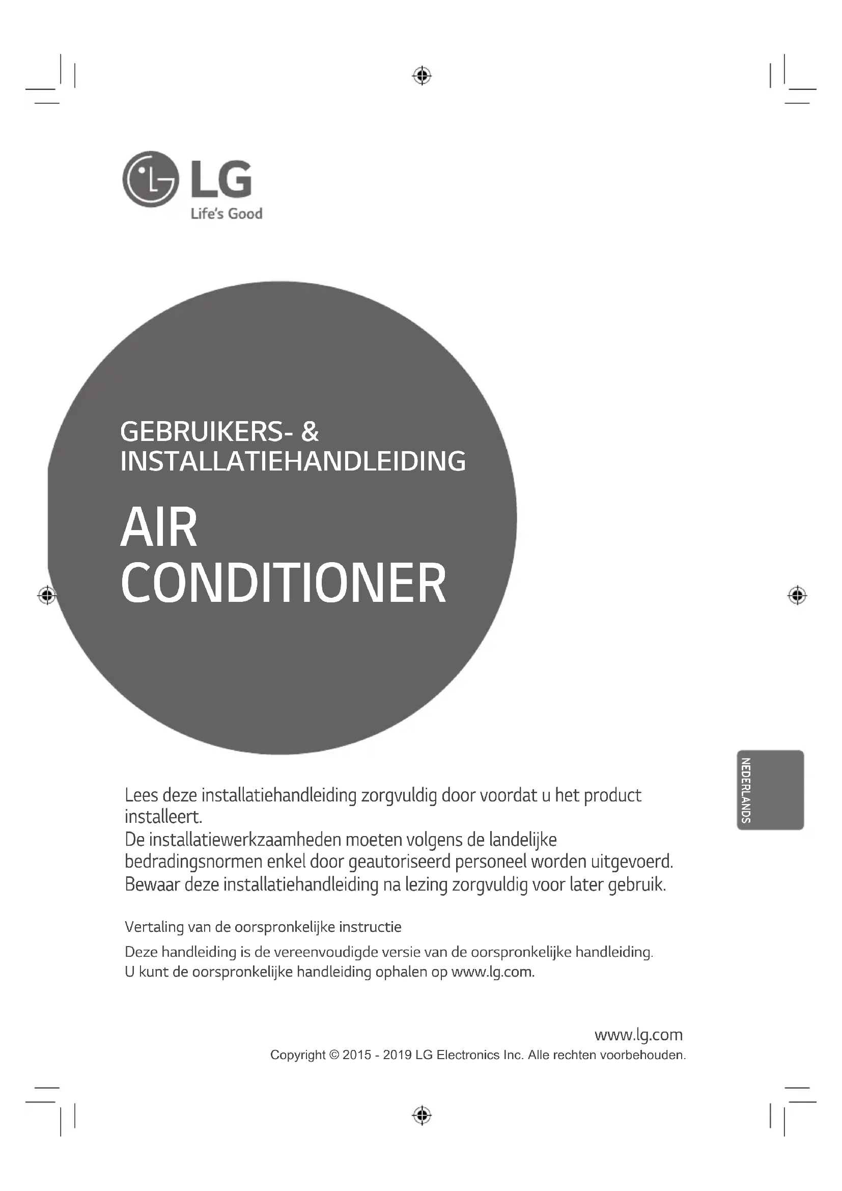 - Tento výrobek byl zapojen do přepěťové ochranné jednotky. Může dojít k chybě, ale jedná se o běžnou záležitost. Po několika minutách bude opět normálně v provozu.18 ČEŠTINAGEBRUIKERS- & INSTALLATIEHANDLEIDING Vertaling van de oorspronkelijke instructie Deze handleiding is de vereenvoudigde versie van de oorspronkelijke handleiding. U kunt de oorspronkelijke handleiding ophalen op www.lg.com. AIR CONDITIONER www.lg.com Lees deze installatiehandleiding zorgvuldig door voordat u het product installeert. De installatiewerkzaamheden moeten volgens de landelijke bedradingsnormen enkel door geautoriseerd personeel worden uitgevoerd. Bewaar deze installatiehandleiding na lezing zorgvuldig voor later gebruik. Copyright © 2015 - 2019 LG Electronics Inc. Alle rechten voorbehouden. NEDERLANDS2 MODEL NAAM NEDERLANDS MODEL NAAM - Productnaam : Airconditioner - Modelnaam: - Additionele Informatie : serienummer staat op de barcode op het product. - Max toelaatbare druk Hoge kant : 4.2 MPa / 4.32 MPa (Het kan per model verschillen) Lage kant : 2.4 MPa - Koelmiddel : R32 Productinformatie Serienummer Binnenunit / Buitenunits Gedetailleerd producttype alleen voor modellen van de M-serie AQ : Op een wand gemonteerd Libero-R SQ : Op een wand gemonteerd Libero-E AH* : ARTCOOL AW* : ART COOL Mirror AH : Plafondcassette AHL: In het plafond verborgen leiding (Laag statisch) Gedetailleerd producttype voor modellen van de U- / C- series L : Laag statisch H : Hoge COP E : Econo F : Vrije combinatie FH : Vrije combinatie Hoge COP Nominale capaciteit Bijv.) 7 000 Btu/h Klasse → '07', 18 000 Btu/h Class → '18' Producttype Aansluitbaar type buitenunit Chassisnaam