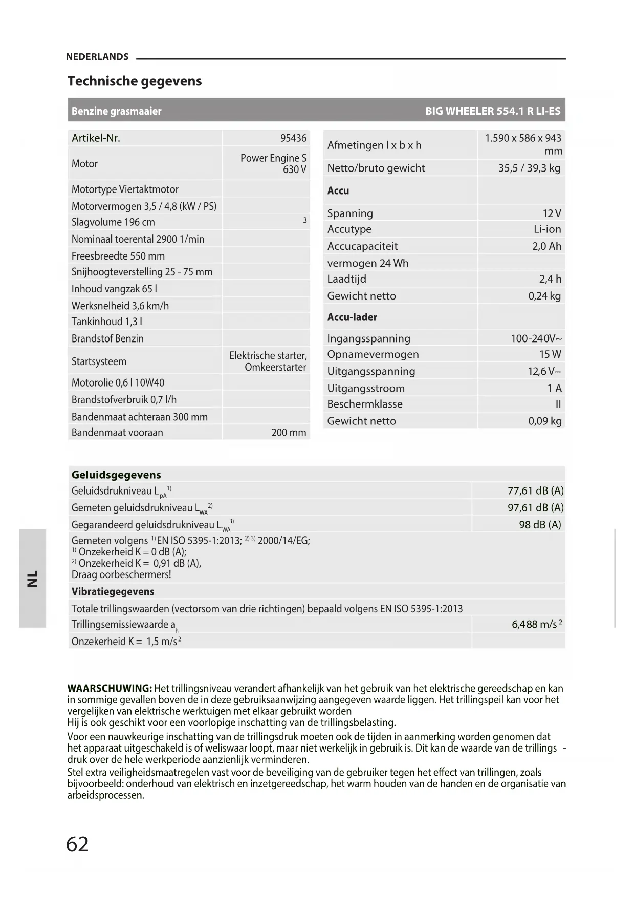 Onzekerheid K = 0,91 dB (A), Draag oorbeschermers! Vibratiegegevens Totale trillingswaarden (vectorsom van drie richtingen) bepaald volgens EN ISO 5395-1:2013 Trillingsemissiewaarde a
