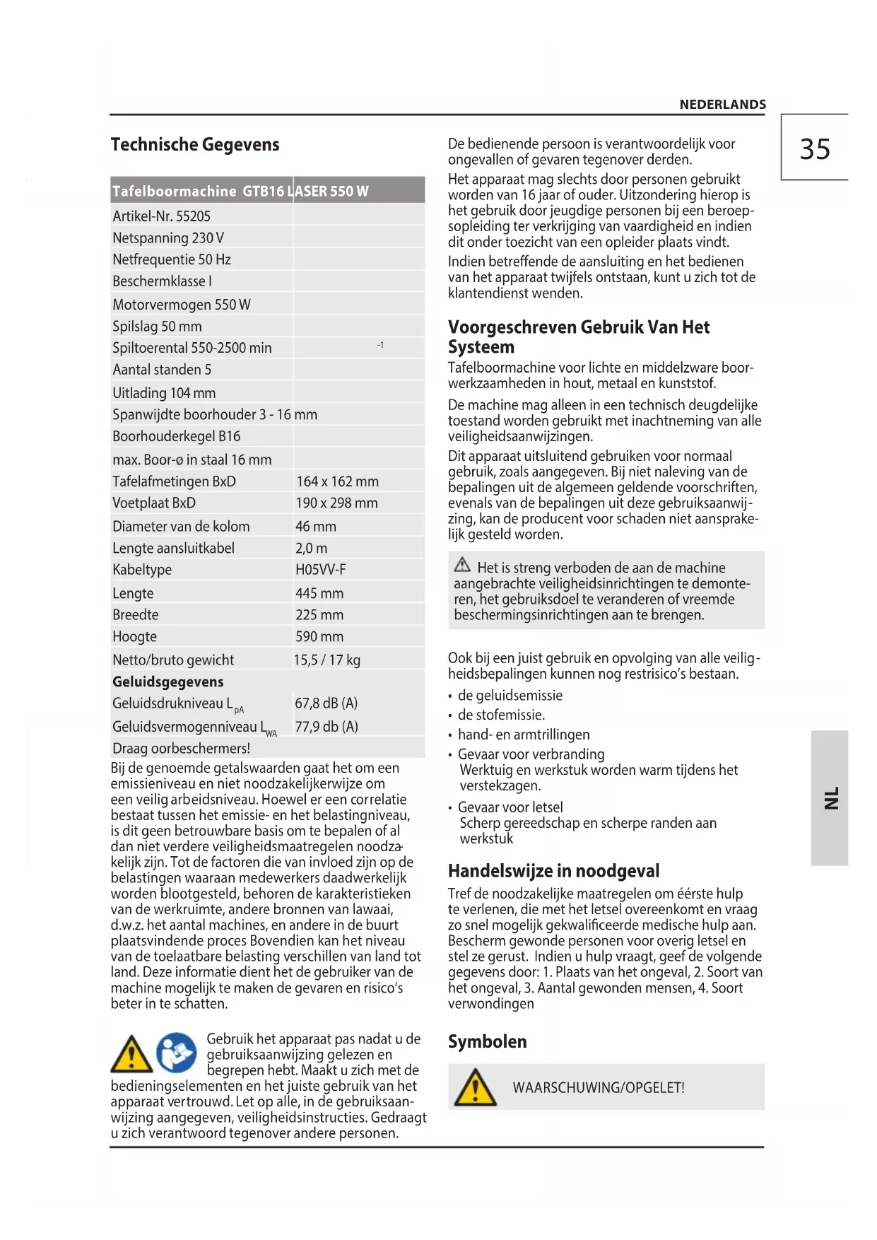 sopleiding ter verkrijging van vaardigheid en indien dit onder toezicht van een opleider plaats vindt. Indien betreende de aansluiting en het bedienen van het apparaat twijfels ontstaan, kunt u zich tot de klantendienst wenden. Voorgeschreven Gebruik Van Het Systeem Tafelboormachine voor lichte en middelzware boor- werkzaamheden in hout, metaal en kunststof. De machine mag alleen in een technisch deugdelijke toestand worden gebruikt met inachtneming van alle veiligheidsaanwijzingen. Dit apparaat uitsluitend gebruiken voor normaal gebruik, zoals aangegeven. Bij niet naleving van de bepalingen uit de algemeen geldende voorschriften, evenals van de bepalingen uit deze gebruiksaanwij