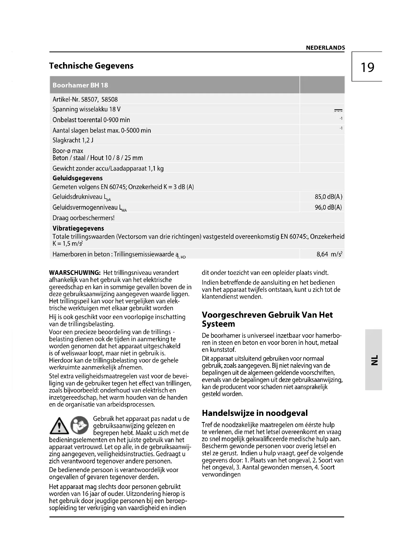 sopleiding ter verkrijging van vaardigheid en indien dit onder toezicht van een opleider plaats vindt. Indien betreende de aansluiting en het bedienen van het apparaat twijfels ontstaan, kunt u zich tot de klantendienst wenden. Voorgeschreven Gebruik Van Het Systeem De boorhamer is universeel inzetbaar voor hamerbo- ren in steen en beton en voor boren in hout, metaal en kunststof. Dit apparaat uitsluitend gebruiken voor normaal gebruik, zoals aangegeven. Bij niet naleving van de bepalingen uit de algemeen geldende voorschriften, evenals van de bepalingen uit deze gebruiksaanwijzing, kan de producent voor schaden niet aansprakelijk gesteld worden. Handelswijze in noodgeval Tref de noodzakelijke maatregelen om éérste hulp teverlenen, die met het letsel overeenkomt en vraag zo snelmogelijk gekwaliceerde medische hulp aan. Beschermgewonde personen voor overig letsel en stel ze gerust. Indien u hulp vraagt, geef de volgende gegevens door: 1. Plaats van het ongeval, 2. Soort van het ongeval, 3. Aantal gewonden mensen, 4. Soort verwondingenD