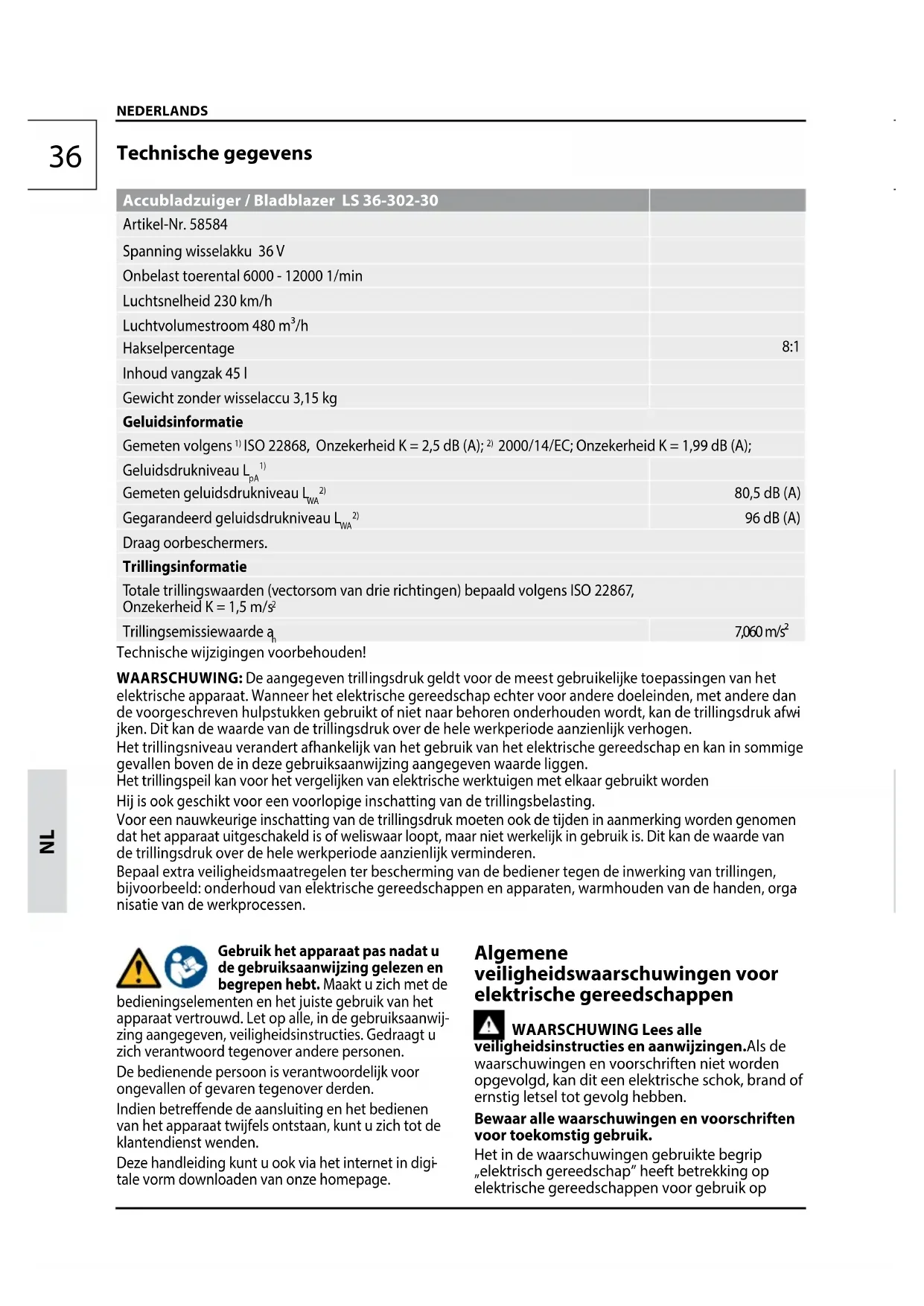 deerde bescherming tegen zogenoemde „dode of witte vingers“ of het carpale tunnel syndroom. Daarom moet bij een regelmatig langdurig gebruik de toestand van vingers en handwortels nauwlettend gecontroleerd worden. Indien symp- tomen van de bovengenoemde ziekten optreden, onmiddellijk een arts bezoeken. Om het risico van „dode of witte vingers“ te verlagen, moet u uw vingers tijdens de werkzaamheden warm houden en regelmatig een pauze inlassen. VOORZICHTIG Gehoorbeschadigingen Langer verblijf in de directe omgeving van het draaiende apparaat kan tot gehoorbeschadi- gingen leiden. Draag oorbeschermers. Geluidsoverlast. Een bepaald geluidsniveau van de machine kan niet worden voorkomen. Voor regelmatige geluidsoverlast veroorzakende werkzaamheden is toestemming nodig en is beperkt tot bepaalde perioden. Houdt u zich aan de rusttijden en beperkt de dagelijkse werktijd tot een minimum. Draag zelf, evenals personen in de directe omgeving, voor persoonlijke veiligheid een geschikte gehoorbescherming. Let op: in woongebieden mag dit apparaat volgens de Duitse wetgeving van september 2002 inzake de preventie van machinegeluiden niet worden gebruikt op zon- en feestdagen en op werkdagen van 20:00 uur tot 7:00 uur. Daarnaast geldt het gebruiksverbod op volgende tijdstippen van de dag: van 7.00 uur tot