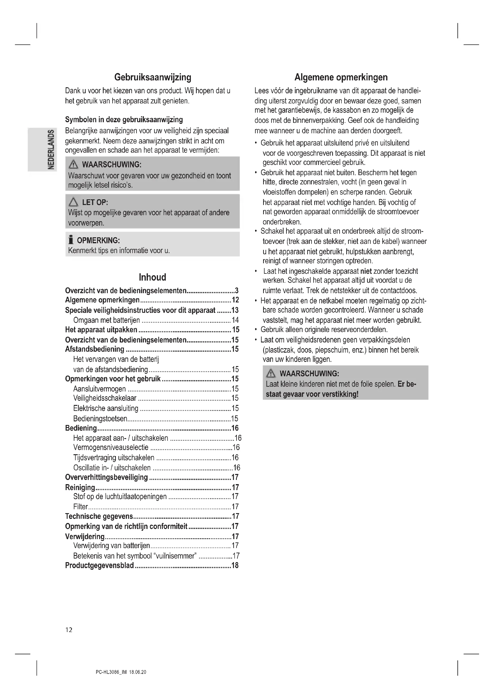 - Verordening (EU) 2015 / 1188 van de commissie (Productgegevensblad zie pagina 18) Verwijdering Verwijdering van batterijen Als consument bent u wettelijk verplicht om oude batterijen / accu’s terug te brengen. Verwijder de batterij uit de afstandsbediening vóór het wegwerpen van het apparaat. Breng de batterij naar een inzamelpunt voor de inzameling van oude batterijen of gevaarlijk afval. Neem contact op met de plaatselijke overheid voor informatie. Betekenis van het symbool “vuilnisemmer” Bescherm ons milieu, elektrische apparaten horen niet in het huisafval. Maak voor het afvoeren van elektrische apparaten gebruik van de voorgeschreven verzamelpunten en geef daar de elektrische apparaten af die u niet meer gebruikt. Daardoor helpt u de potentiële effecten te voorkomen die een verkeerde afvoer op het milieu en de menselijke gezondheid kunnen hebben. Op deze wijze levert u uw bijdrage aan het hergebruik, de recycling en andere verwerkingsvormen voor oude elektro- nische en elektrische apparaten. Voor informatie over verzamelpunten voor uw apparaten kunt u contact opnemen met uw gemeente of gemeentead- ministratie.PC-HL3086_IM 18.06.20