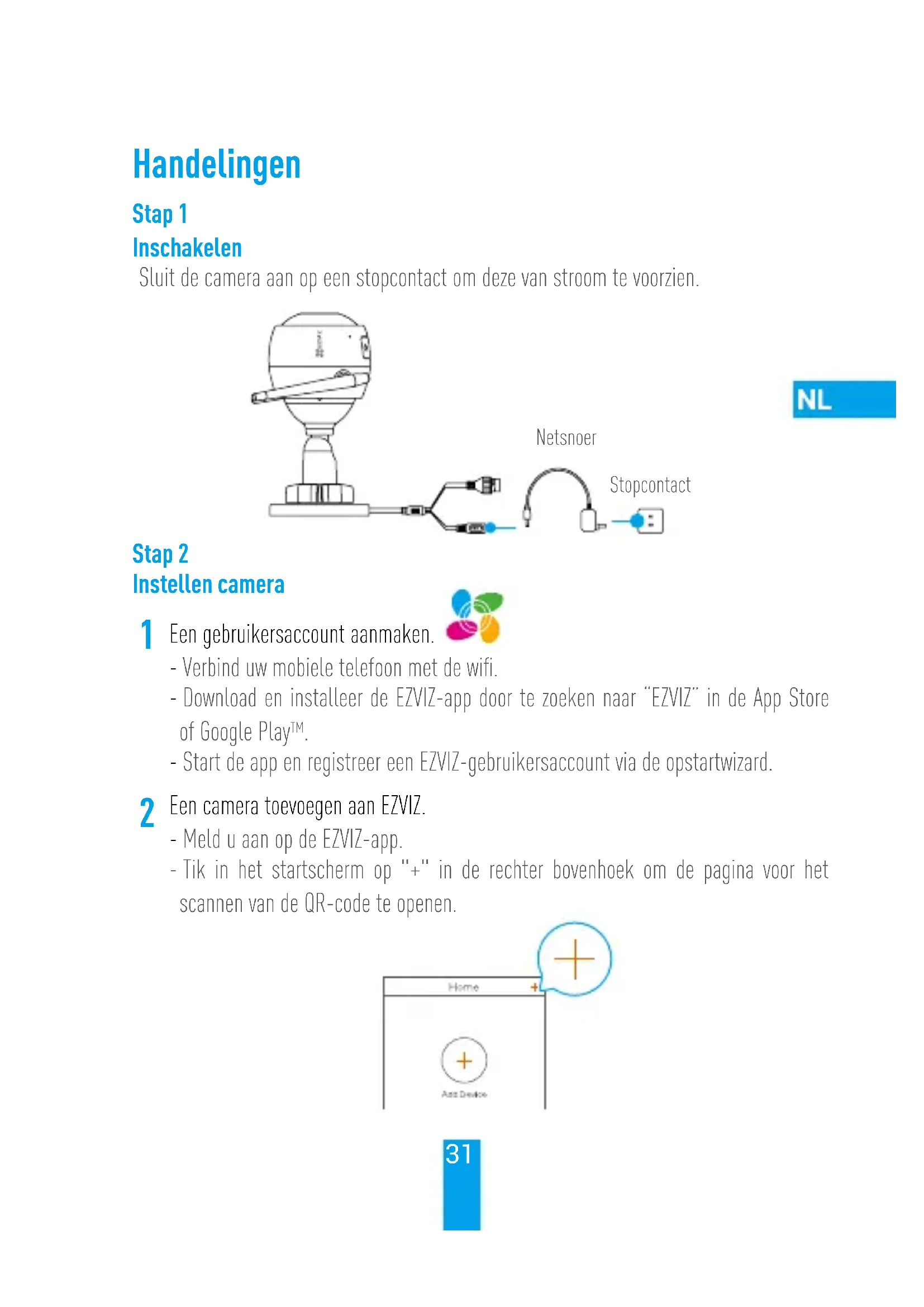 Een gebruikersaccount aanmaken. - Verbind uw mobiele telefoon met de wifi. - Download en installeer de EZVIZ-app door te zoeken naar “EZVIZ” in de App Store of Google Play