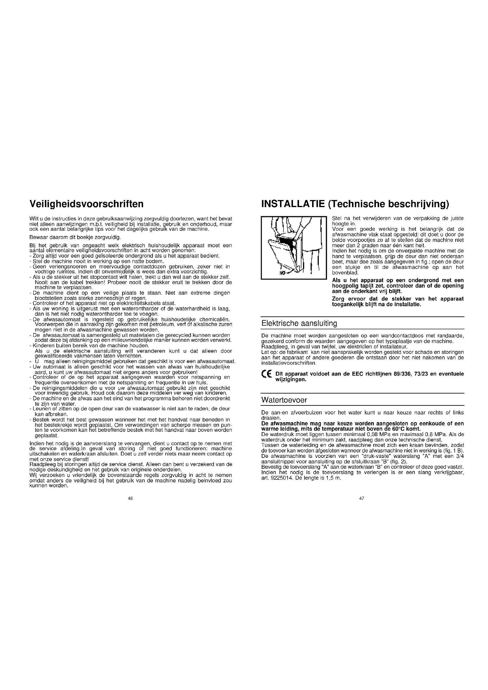 Fig. A47 INSTALLATIE (Technische beschrijving) Stel na het verwijderen van de verpakking de juiste hoogte in. Voor een goede werking is het belangrijk dat de afwasmachine vlak staat opgesteld: dit doet u door de beide voorpootjes zo af te stellen dat de machine niet meer dan 2 graden naar één kant helt. Indien het nodig is om de onverpakte machine met de hand te verplaatsen, grijp de deur dan niet onderaan beet, maar doe zoals aangegeven in fig.; open de deur een stukje en til de afwasmachine op aan het bovenblad. Als u het apparaat op een ondergrond met een hoogpolig tapijt zet, controleer dan of de opening aan de onderkant vrij blijft. Zorg ervoor dat de stekker van het apparaat toegankelijk blijft na de installatie. Elektrische aansluiting De machine moet worden aangesloten op een wandcontactdoos met randaarde, gezekerd conform de waarden aangegeven op het typeplaatje van de machine. Raadpleeg, in geval van twijfel, uw elektricïen of installateur. Let op: de fabrikant kan niet aansprakelijk worden gesteld voor schade en storingen aan het apparaat of andere goederen die ontstaan door het niet nakomen van de installatievoorschriften. Dit apparaat voldoet aan de EEC richtlijnen 89/336, 73/23 en eventuele wijzigingen. Watertoevoer De aan-en afvoerbuizen voor het water kunt u naar keuze naar rechts of links draaien. De afwasmachine mag naar keuze worden aangesloten op eenkoude of een warme leiding, mits de temperatuur niet boven de 60°C komt. De waterdruk moet liggen tussen minimaal 0,08 MPa en maximaal 0,8 MPa. Als de waterdruk onder het minimum zakt, raadpleeg dan onze technische dienst. Tussen de waterleiding en de afwasmachine moet zich een kraan bevinden, zodat de toevoer kan worden afgesloten wanneer de afwasmachine niet in werking is (fig. 1 B). De afwasmachine is voorzien van een "druk-vaste" waterslang "A" met een 3/4 aansluitnippel voor aansluiting op de afsluitkraan "B" (fig. 2). Bevestig de toevoerslang "A" aan de waterkraan "B" en controleer of deze goed vastzit. Indien het nodig is de toevoerslang te verlengen is er een slang verkrijgbaar, art. 9225014. De lengte is 1,5 m.
