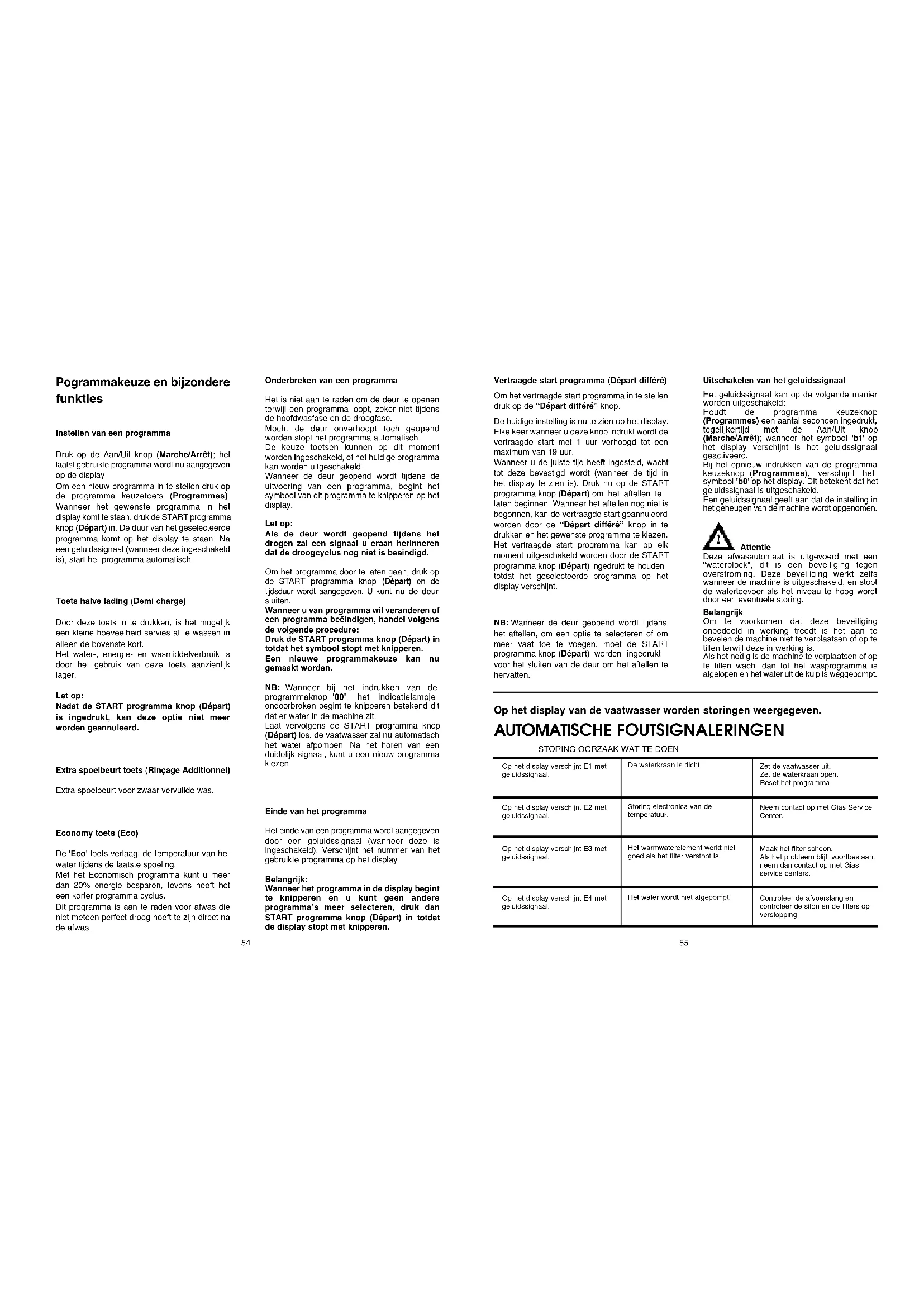 Vertraagde start programma (Départ différé) Om het vertraagde start programma in te stellen druk op de “Départ différé” knop. De huidige instelling is nu te zien op het display. Elke keer wanneer u deze knop indrukt wordt de vertraagde start met 1 uur verhoogd tot een maximum van 19 uur. Wanneer u de juiste tijd heeft ingesteld, wacht tot deze bevestigd wordt (wanneer de tijd in het display te zien is). Druk nu op de START programma knop (Départ) om het aftellen te laten beginnen. Wanneer het aftellen nog niet is begonnen, kan de vertraagde start geannuleerd worden door de “Départ différé” knop in te drukken en het gewenste programma te kiezen. Het vertraagde start programma kan op elk moment uitgeschakeld worden door de START programma knop (Départ) ingedrukt te houden totdat het geselecteerde programma op het display verschijnt. NB: Wanneer de deur geopend wordt tijdens het aftellen, om een optie te selecteren of om meer vaat toe te voegen, moet de START programma knop (Départ) worden ingedrukt voor het sluiten van de deur om het aftellen te hervatten. Uitschakelen van het geluidssignaal Het geluidssignaal kan op de volgende manier worden uitgeschakeld: Houdt de programma keuzeknop (Programmes) een aantal seconden ingedrukt, tegelijkertijd met de Aan/Uit knop (Marche/Arrêt); wanneer het symbool 'b1' op het display verschijnt is het geluidssignaal geactiveerd. Bij het opnieuw indrukken van de programma keuzeknop (Programmes), verschijnt het symbool 'b0' op het display. Dit betekent dat het geluidssignaal is uitgeschakeld. Een geluidssignaal geeft aan dat de instelling in het geheugen van de machine wordt opgenomen. Attentie Deze afwasautomaat is uitgevoerd met een "waterblock", dit is een beveiliging tegen overstroming. Deze beveiliging werkt zelfs wanneer de machine is uitgeschakeld, en stopt de watertoevoer als het niveau te hoog wordt door een eventuele storing. Belangrijk Om te voorkomen dat deze beveiliging onbedoeld in werking treedt is het aan te bevelen de machine niet te verplaatsen of op te tillen terwijl deze in werking is. Als het nodig is de machine te verplaatsen of op te tillen wacht dan tot het wasprogramma is afgelopen en het water uit de kuip is weggepompt. Op het display verschijnt E1 met geluidssignaal. Op het display verschijnt E2 met geluidssignaal. Op het display verschijnt E3 met geluidssignaal. Op het display verschijnt E4 met geluidssignaal.