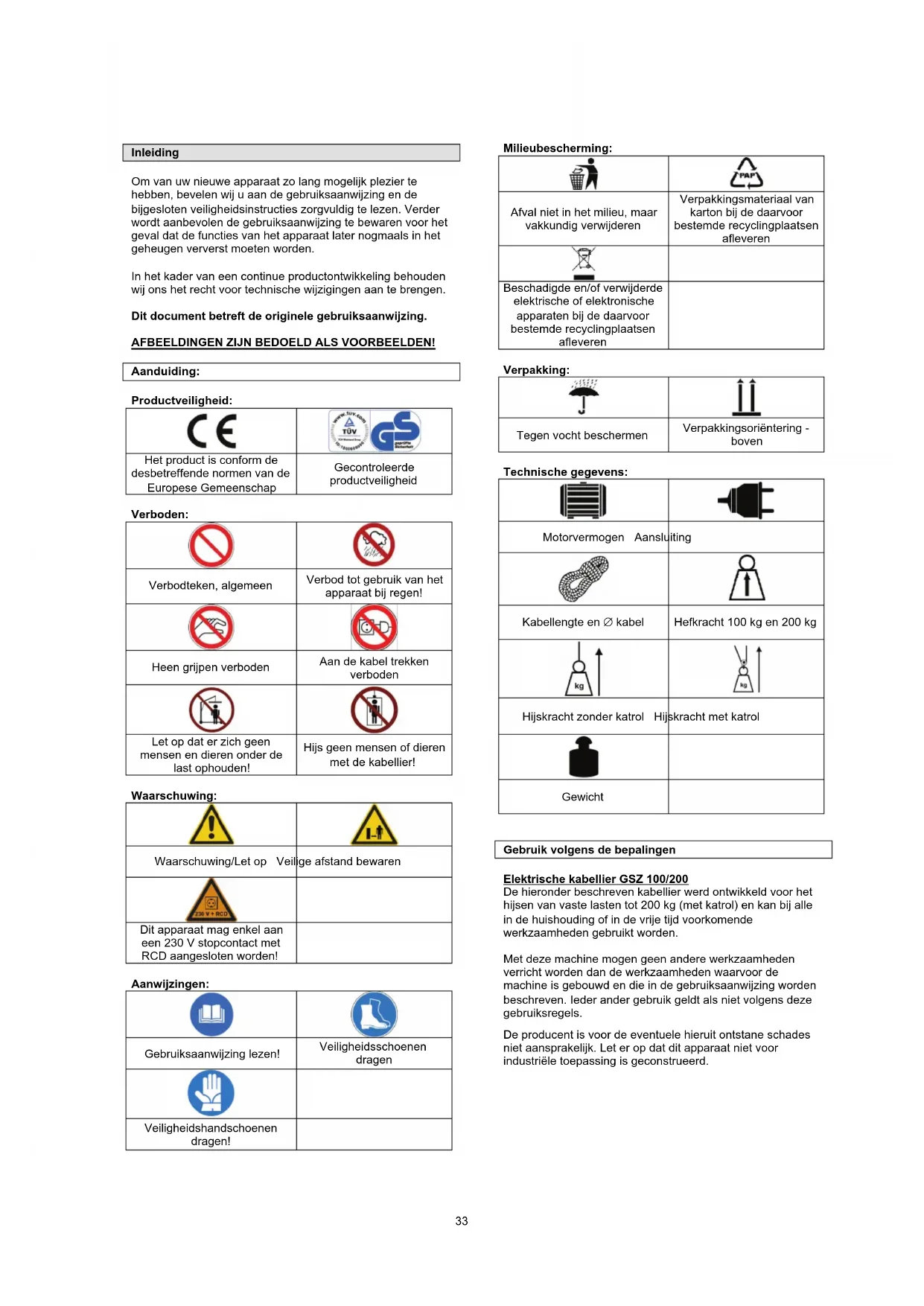 Gebruik volgens de bepalingen Elektrische kabellier GSZ 100/200 De hieronder beschreven kabellier werd ontwikkeld voor het hijsen van vaste lasten tot 200 kg (met katrol) en kan bij alle in de huishouding of in de vrije tijd voorkomende werkzaamheden gebruikt worden. Met deze machine mogen geen andere werkzaamheden verricht worden dan de werkzaamheden waarvoor de machine is gebouwd en die in de gebruiksaanwijzing worden beschreven. Ieder ander gebruik geldt als niet volgens deze gebruiksregels. De producent is voor de eventuele hieruit ontstane schades niet aansprakelijk. Let er op dat dit apparaat niet voor industriële toepassing is geconstrueerd.