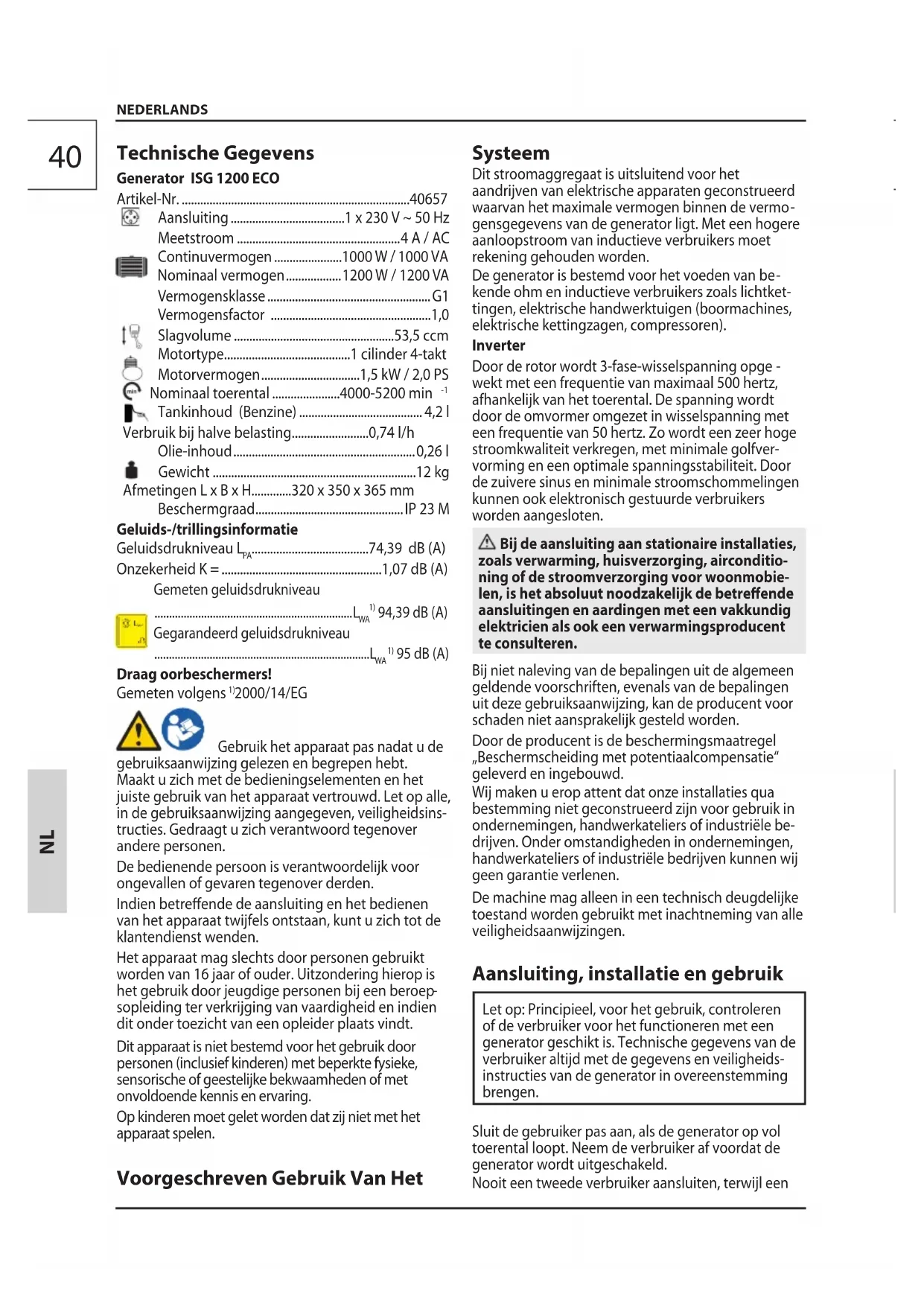 drijven. Onder omstandigheden in ondernemingen, handwerkateliers of industriële bedrijven kunnen wij geen garantie verlenen. De machine mag alleen in een technisch deugdelijke toestand worden gebruikt met inachtneming van alle veiligheidsaanwijzingen. Aansluiting, installatie en gebruik Let op: Principieel, voor het gebruik, controleren of de verbruiker voor het functioneren met een generator geschikt is. Technische gegevens van de verbruiker altijd met de gegevens en veiligheids- instructies van de generator in overeenstemming brengen. Sluit de gebruiker pas aan, als de generator op vol toerental loopt. Neem de verbruiker af voordat de generator wordt uitgeschakeld. Nooit een tweede verbruiker aansluiten, terwijl een Technische Gegevens Generator ISG 1200 ECO Artikel-Nr. ..........................................................................40657
