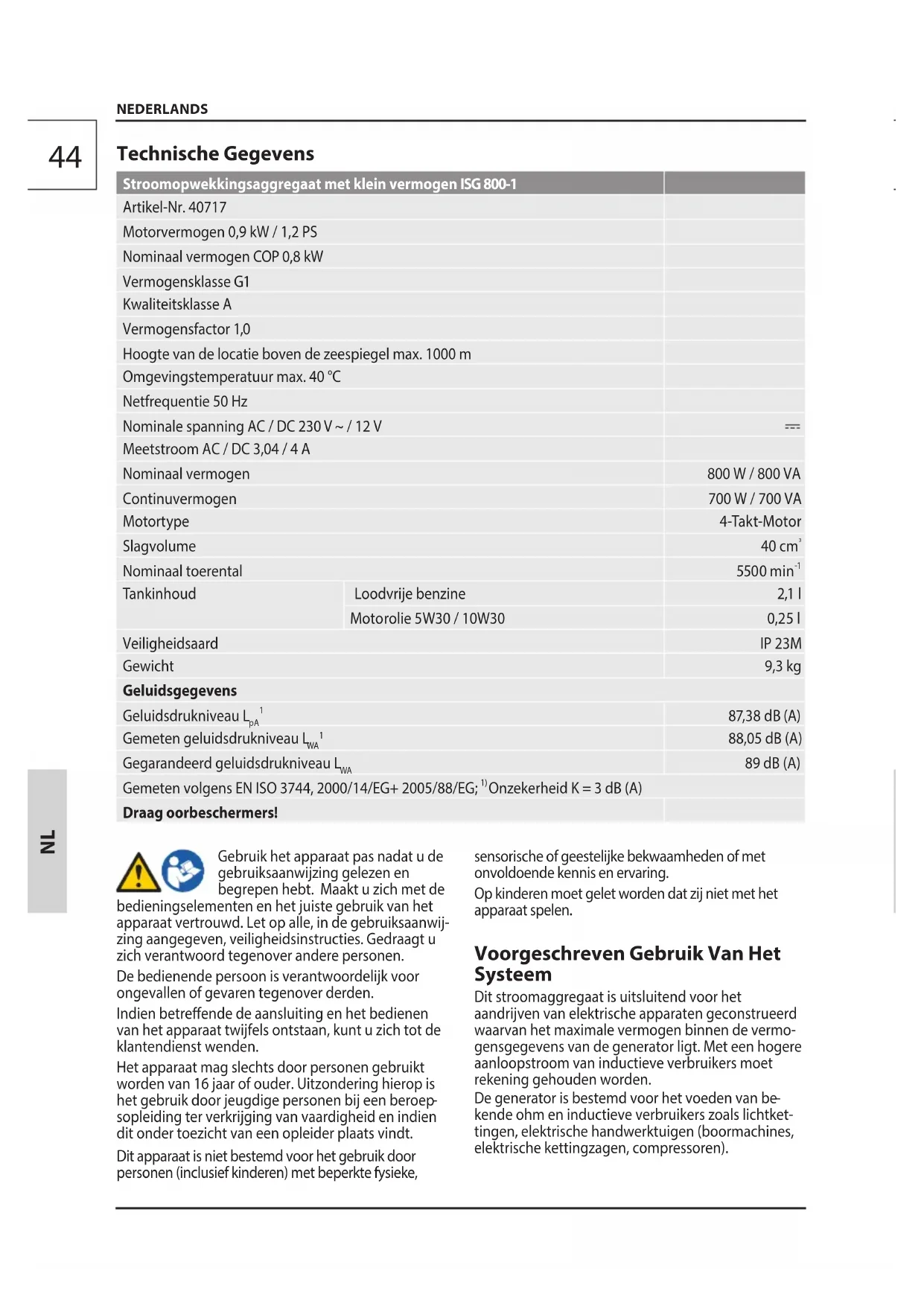 sopleiding ter verkrijging van vaardigheid en indien dit onder toezicht van een opleider plaats vindt. Dit apparaat is niet bestemd voor het gebruik door personen (inclusief kinderen) met beperkte fysieke, sensorische of geestelijke bekwaamheden of met onvoldoende kennis en ervaring. Op kinderen moet gelet worden dat zij niet met het apparaat spelen. Voorgeschreven Gebruik Van Het Systeem Dit stroomaggregaat is uitsluitend voor het aandrijven van elektrische apparaten geconstrueerd waarvan het maximale vermogen binnen de vermo- gensgegevens van de generator ligt. Met een hogere aanloopstroom van inductieve verbruikers moet rekening gehouden worden. De generator is bestemd voor het voeden van be