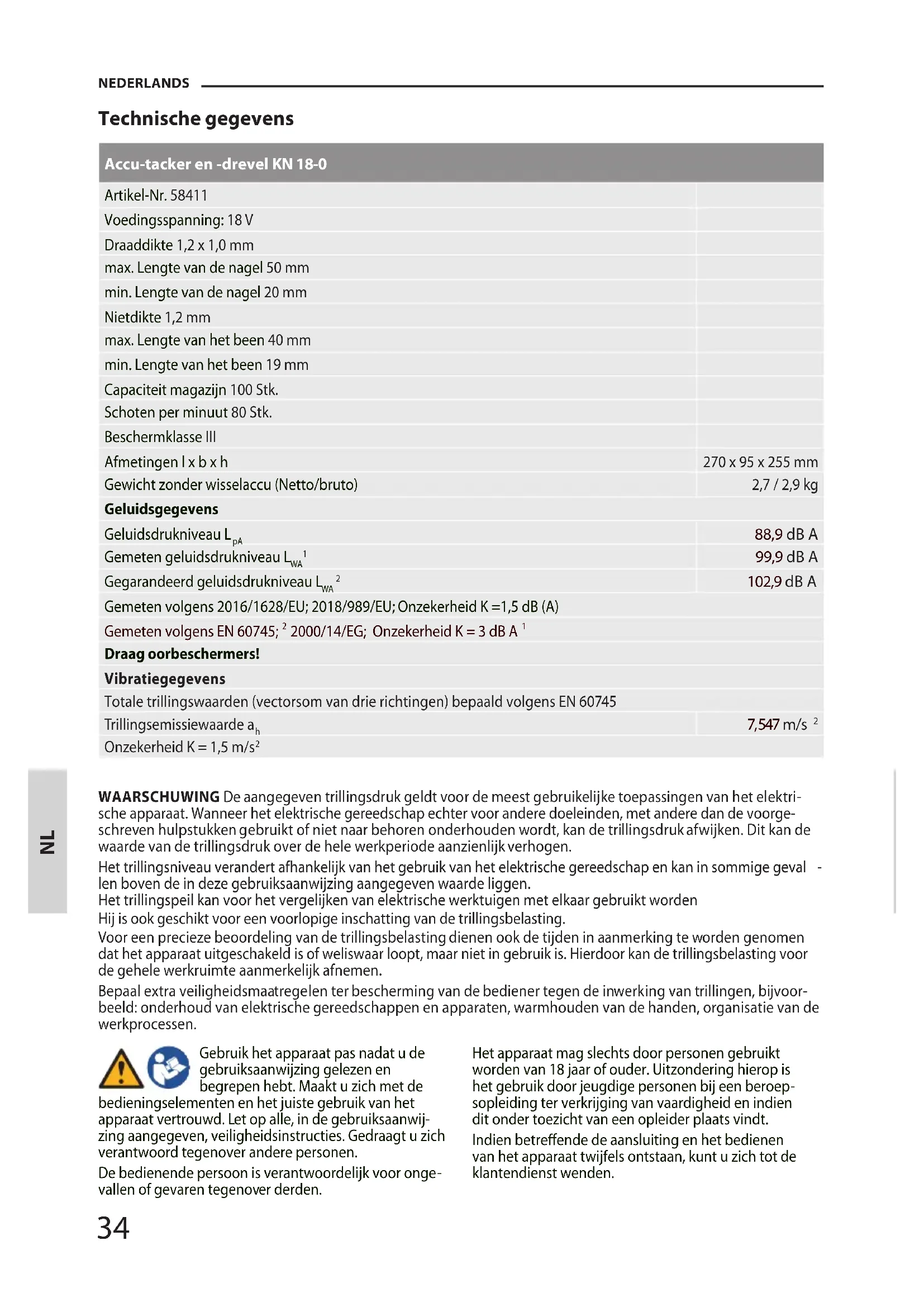 Technische gegevens Accu-tacker en -drevel KN 18-0 Artikel-Nr. 58411 Voedingsspanning: 18 V Draaddikte 1,2 x 1,0 mm max. Lengte van de nagel 50 mm min. Lengte van de nagel 20 mm Nietdikte 1,2 mm max. Lengte van het been 40 mm min. Lengte van het been 19 mm Capaciteit magazijn 100 Stk. Schoten per minuut 80 Stk. Beschermklasse III Afmetingen l x b x h 270 x 95 x 255 mm Gewicht zonder wisselaccu (Netto/bruto) 2,7 / 2,9 kg Geluidsgegevens Geluidsdrukniveau L