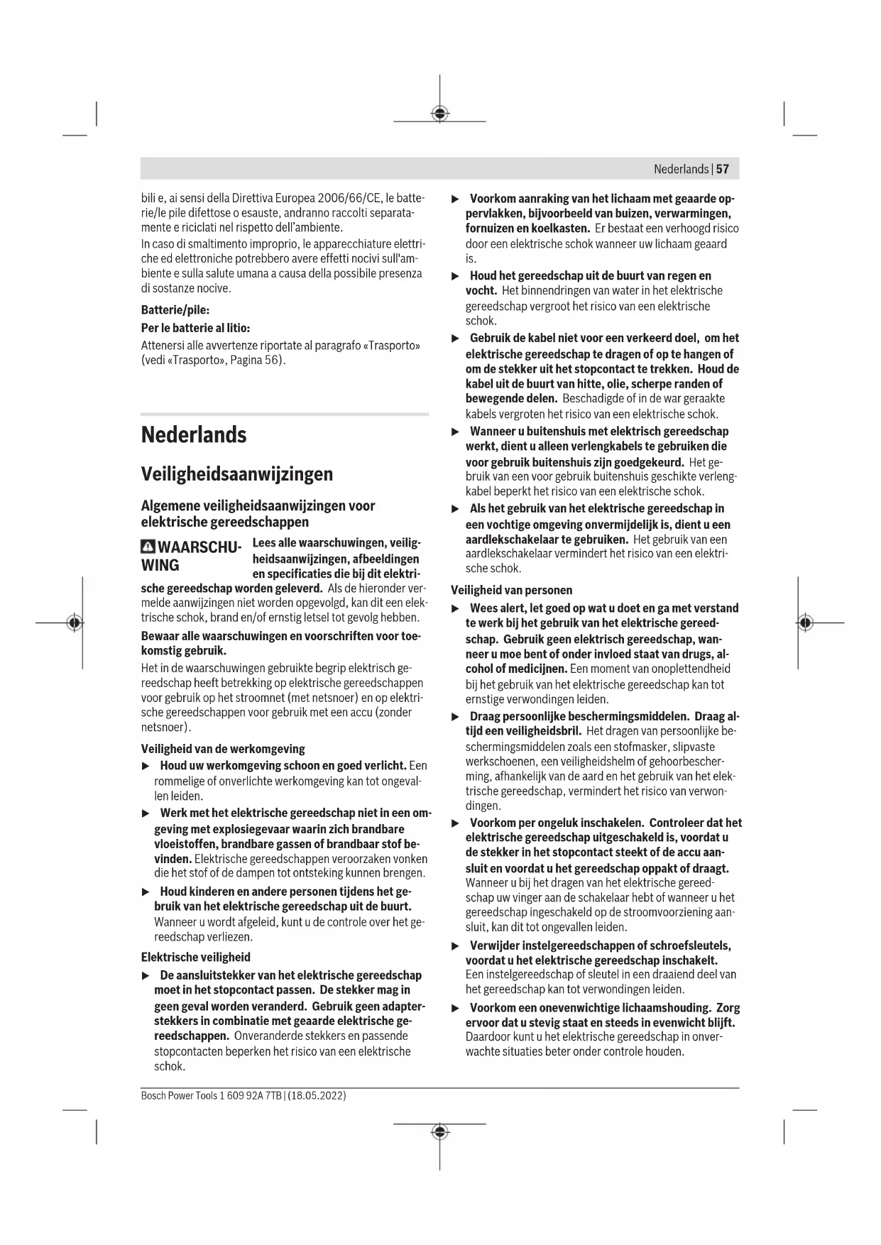 La marcatura di taglio a 0° (12) indica la posizione della lama in caso di taglio ad angolo retto. La marcatura di taglio a 45° (13) indica la posizione della lama in caso di taglio a 45°. Per eseguire un taglio preciso, applicare la sega circolare sul pezzo in lavorazione come indicato nell’illustrazione. È prefe- ribile eseguire prima un taglio di prova. Messa in funzione Inserimento della batteria Inserire la batteria carica (3) nell'elettroutensile fino a quan- do la batteria è bloccata in modo sicuro. Avvio/arresto Per la messa in funzione dell’elettroutensile, azionare dap- prima il dispositivo di blocco (1) e successivamente preme- re e l’interruttore di avvio/arresto (2) e tenerlo premuto. Per spegnere l’elettroutensile, rilasciare l’interruttore di av- vio/arresto (2). Avvertenza: Per ragioni di sicurezza, l’interruttore di avvio/ arresto (2) non può essere bloccato, ma deve invece restare costantemente premuto durante il funzionamento. Protezione contro lo scaricamento totale La batteria al litio è protetta contro lo scaricamento comple- to dal sistema «Electronic Cell Protection (ECP)». In caso di batteria scarica l’elettroutensile si spegne attraverso un in- terruttore automatico: l’accessorio non si muove più. Indicazioni operative u Prima di qualsiasi intervento sull’elettroutensile (ad es. interventi di manutenzione, sostituzione dell’ac- cessorio ecc.), prelevare la batteria, anche nel caso in cui occorra trasportarlo o conservarlo. In caso di azio- namento accidentale dell’interruttore di avvio/arresto sussiste pericolo di lesioni. La larghezza di taglio varia in base al tipo di lama utilizzato. Proteggere le lame da urti e da colpi. Operare con l’elettroutensile spingendolo in modo uniforme in direzione di taglio ed esercitando una leggera pressione. Un avanzamento eccessivo contribuisce a ridurre sensibil- mente la durata degli utensili e può danneggiare l’elettrou- tensile. Bosch Power Tools 1 609 92A 7TB | (18.05.2022)56 | Italiano La prestazione di taglio e la qualità del taglio dipendono con- siderevolmente dallo stato e dalla forma dei denti della lama. Per questo motivo, utilizzare esclusivamente lame che siano taglienti e adatte al materiale in lavorazione. Taglio del legno La corretta selezione della lama viene basata sul tipo di le- gno, sulla qualità del legno e sul fatto se i tagli richiesti deb- bano essere longitudinali oppure trasversali. Eseguendo tagli longitudinali nell’abete si producono trucioli lunghi ed a forma di spirale. La polvere di faggio e di quercia è particolarmente pericolo- sa per la salute, per questo si raccomanda di lavorare esclu- sivamente con un sistema di aspirazione della polvere. Taglio con guida parallela (vedere Fig. D) La guida parallela (10) consente la realizzazione di tagli pre- cisi lungo il bordo del pezzo in lavorazione o il taglio di stri- sce identiche. Spingere l’asta di guida della guida parallela (10), attraverso la guida, nella piastra di base (8). Fissare la guida parallela (10) mediante la vite ad alette (15). Taglio con battuta ausiliaria (vedi fig. E) Per la lavorazione di grossi pezzi, o per tagliare spigoli diritti, è possibile fissare al pezzo in lavorazione una tavola o un as- se che fungano da battuta ausiliaria e operare quindi spin- gendo la sega circolare con il pattino lungo la battuta ausilia- ria. Avvertenze per l’impiego ottimale della batteria Proteggere la batteria ricaricabile da umidità ed acqua. Conservare la batteria esclusivamente nel campo di tempe- ratura fra −20 °C e 50°C. Non lasciare la batteria all’interno dell’auto, ad es. nel periodo estivo. Pulire di tanto in tanto le fessure di ventilazione della batte- ria ricaricabile con un pennello morbido, pulito ed asciutto. Una sensibile riduzione della durata del funzionamento dopo l’operazione di ricarica sta ad indicare che la batteria ricari- cabile dovrà essere sostituita. Attenersi alle indicazioni relative allo smaltimento. Manutenzione ed assistenza Manutenzione e pulizia u Prima di qualsiasi intervento sull’elettroutensile (ad es. interventi di manutenzione, sostituzione dell’ac- cessorio ecc.), prelevare la batteria, anche nel caso in cui occorra trasportarlo o conservarlo. In caso di azio- namento accidentale dell’interruttore di avvio/arresto sussiste pericolo di lesioni. u Per poter garantire buone e sicure operazioni di lavo- ro, tenere sempre pulite l’elettroutensile e le fessure di ventilazione. La cuffia oscillante di protezione deve poter sempre muover- si liberamente e deve poter chiudersi sempre autonoma- mente. Per questo motivo, tenere sempre pulito il campo in- torno alla cuffia di protezione oscillante. Rimuovere polvere e trucioli con un pennello. È possibile proteggere dalla corrosione le lame non rivestite applicando un sottile strato di olio esente da acidi. Per non macchiare il legno in lavorazione, prima di riutilizzare le lame sarà necessario pulirle bene dall’olio. Resti di resina oppure di colla sulla lama di taglio compro- mettono la qualità del taglio. Per questo motivo pulire sem- pre le lame subito dopo l’utilizzo. Servizio di assistenza e consulenza tecnica Il servizio di assistenza risponde alle Vostre domande relati- ve alla riparazione e alla manutenzione del Vostro prodotto nonché concernenti i pezzi di ricambio. Disegni in vista esplosa e informazioni relative ai pezzi di ricambio sono con- sultabili anche sul sito www.bosch-pt.com Il team di consulenza tecnica Bosch sarà lieto di rispondere alle Vostre domande in merito ai nostri prodotti e accessori. In caso di richieste o di ordinazione di pezzi di ricambio, co- municare sempre il codice prodotto a 10cifre riportato sulla targhetta di fabbricazione dell’elettroutensile. Italia Tel.: (02) 3696 2314 E-Mail: pt.hotlinebosch@it.bosch.com Per ulteriori indirizzi del servizio assistenza consultare: www.bosch-pt.com/serviceaddresses Trasporto Le batterie al litio consigliate so