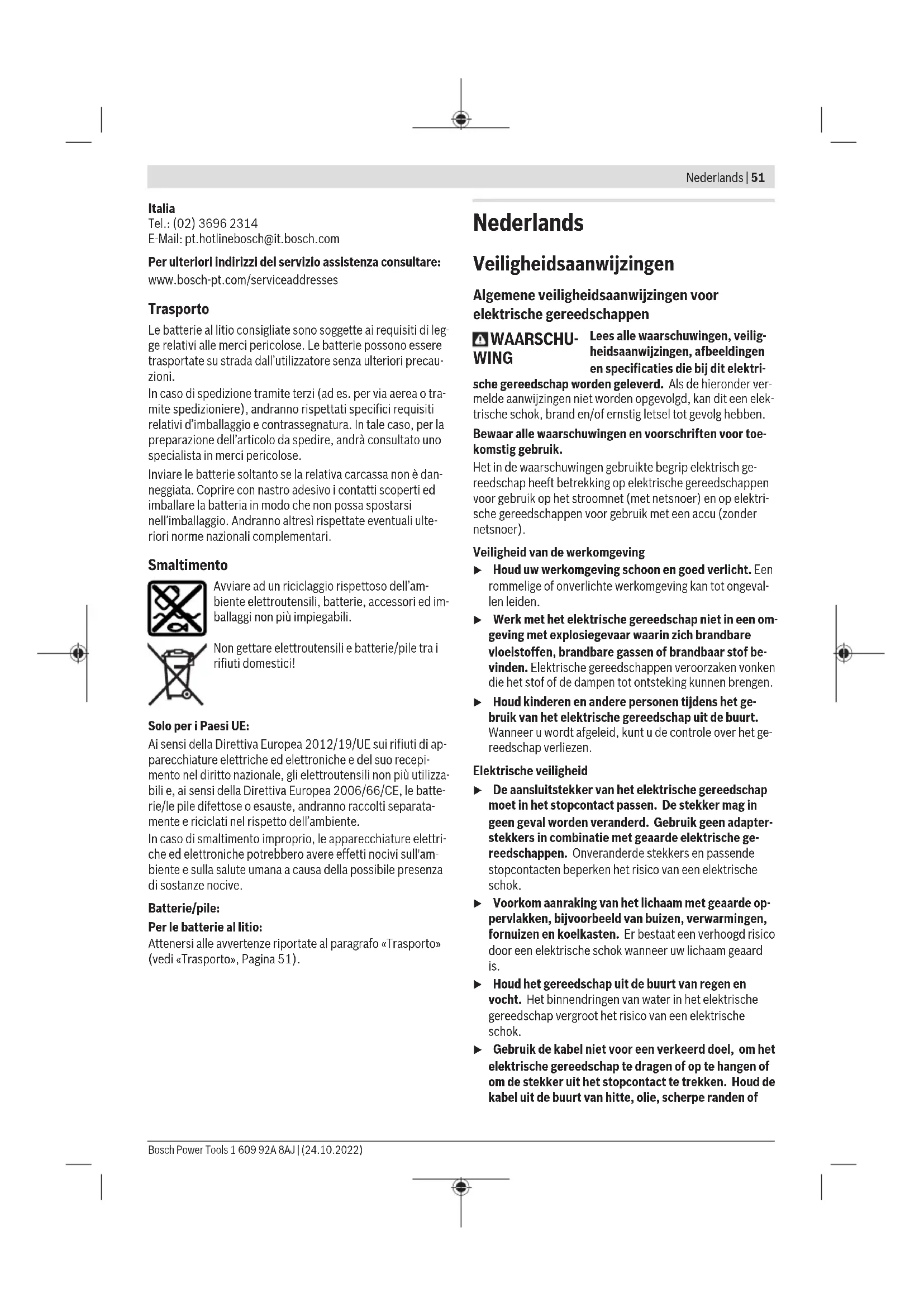 Low Energy Module GCY 30-4 inserito, l’elettroutensile è dotato di interfaccia wireless. An- dranno considerate eventuali limitazioni di funziona- mento, ad es. all’interno di velivoli, oppure negli ospe- dali. u Applicare l’elettroutensile sul dado/sulla vite esclusi- vamente quando è spento. Gli utensili accessori in rota- zione possono scivolare. Dopo un impiego prolungato a velocità ridotta, lasciar raf- freddare l’elettroutensile, facendolo funzionare a vuoto a ve- locità massima per circa 3 minuti. Per la foratura nel metallo utilizzare solamente punte HSS in perfette condizioni ed affilate (HSS=high-speed steel=accia- io rapido ad alte prestazioni). Il programma accessori Bosch garantisce la qualità necessaria. Prima d’inserire viti lunghe e voluminose in materiali duri, andrà eseguito un preforo per circa 2/3 della lunghezza di avvitamento, mediante il diametro del nucleo del filetto. Manutenzione ed assistenza Manutenzione e pulizia u Prima di qualsiasi intervento sull’elettroutensile (ad es. interventi di manutenzione, sostituzione dell’ac- cessorio ecc.), prelevare la batteria, anche nel caso in cui occorra trasportarlo o conservarlo. In caso di azio- namento accidentale dell’interruttore di avvio/arresto sussiste pericolo di lesioni. u Per poter garantire buone e sicure operazioni di lavo- ro, tenere sempre pulite l’elettroutensile e le fessure di ventilazione. Servizio di assistenza e consulenza tecnica Il servizio di assistenza risponde alle Vostre domande relati- ve alla riparazione e alla manutenzione del Vostro prodotto nonché concernenti i pezzi di ricambio. Disegni in vista esplosa e informazioni relative ai pezzi di ricambio sono con- sultabili anche sul sito www.bosch-pt.com Il team di consulenza tecnica Bosch sarà lieto di rispondere alle Vostre domande in merito ai nostri prodotti e accessori. In caso di richieste o di ordinazione di pezzi di ricambio, co- municare sempre il codice prodotto a 10cifre riportato sulla targhetta di fabbricazione dell’elettroutensile. 1 609 92A 8AJ | (24.10.2022) Bosch Power ToolsNederlands | 51 Italia Tel.: (02) 3696 2314 E-Mail: pt.hotlinebosch@it.bosch.com Per ulteriori indirizzi del servizio assistenza consultare: www.bosch-pt.com/serviceaddresses Trasporto Le batterie al litio consigliate sono soggette ai requisiti di leg- ge relativi alle merci pericolose. Le batterie possono essere trasportate su strada dall’utilizzatore senza ulteriori precau- zioni. In caso di spedizione tramite terzi (ad es. per via aerea o tra- mite spedizioniere), andranno rispettati specifici requisiti relativi d’imballaggio e contrassegnatura. In tale caso, per la preparazione dell’articolo da spedire, andrà consultato uno specialista in merci pericolose. Inviare le batterie soltanto se la relativa carcassa non è dan- neggiata. Coprire con nastro adesivo i contatti scoperti ed imballare la batteria in modo che non possa spostarsi nell’imballaggio. Andranno altresì rispettate eventuali ulte- riori norme nazionali complementari. Smaltimento Avviare ad un riciclaggio rispettoso dell’am- biente elettroutensili, batterie, accessori ed im- ballaggi non più impiegabili. Non gettare elettroutensili e batterie/pile tra i rifiuti domestici! Solo per i Paesi UE: Ai sensi della Direttiva Europea 2012/19/UE sui rifiuti di ap- parecchiature elettriche ed elettroniche e del suo recepi- mento nel diritto nazionale, gli elettroutensili non più utilizza- bili e, ai sensi della Direttiva Europea 2006/66/CE, le batte- rie/le pile difettose o esauste, andranno raccolti separata- mente e riciclati nel rispetto dell’ambiente. In caso di smaltimento improprio, le apparecchiature elettri- che ed elettroniche potrebbero avere effetti nocivi sull'am- biente e sulla salute umana a causa della possibile presenza di sostanze nocive. Batterie/pile: Per le batterie al litio: Attenersi alle avvertenze riportate al paragrafo «Trasporto» (vedi «Trasporto», Pagina51). Nederlands Veiligheidsaanwijzingen Algemene veiligheidsaanwijzingen voor elektrische gereedschappen WAARSCHU- WING Lees alle waarschuwingen, veilig- heidsaanwijzingen, afbeeldingen en specificaties die bij dit elektri- sche gereedschap worden geleverd. Als de hieronder ver- melde aanwijzingen niet worden opgevolgd, kan dit een elek- trische schok, brand en/of ernstig letsel tot gevolg hebben. Bewaar alle waarschuwingen en voorschriften voor toe- komstig gebruik. Het in de waarschuwingen gebruikte begrip elektrisch ge- reedschap heeft betrekking op elektrische gereedschappen voor gebruik op het stroomnet (met netsnoer) en op elektri- sche gereedschappen voor gebruik met een accu (zonder netsnoer). Veiligheid van de werkomgeving u Houd uw werkomgeving schoon en goed verlicht. Een rommelige of onverlichte werkomgeving kan tot ongeval- len leiden. u Werk met het elektrische gereedschap niet in een om- geving met explosiegevaar waarin zich brandbare vloeistoffen, brandbare gassen of brandbaar stof be- vinden. Elektrische gereedschappen veroorzaken vonken die het stof of de dampen tot ontsteking kunnen brengen. u Houd kinderen en andere personen tijdens het ge- bruik van het elektrische gereedschap uit de buurt. Wanneer u wordt afgeleid, kunt u de controle over het ge- reedschap verliezen. Elektrische veiligheid u De aansluitstekker van het elektrische gereedschap moet in het stopcontact passen. De stekker mag in geen geval worden veranderd. Gebruik geen adapter- stekkers in combinatie met geaarde elektrische ge- reedschappen. Onveranderde stekkers en passende stopcontacten beperken het risico van een elektrische schok. u Voorkom aanraking van het lichaam met geaarde op- pervlakken, bijvoorbeeld van buizen, verwarmingen, fornuizen en koelkasten. Er bestaat een verhoogd risico door een elektrische schok wanneer uw lichaam geaard is. u Houd het gereedschap uit de buurt van regen en vocht. Het binnendringen van water in het elektrische gereedschap vergroot het risico van een elektrische 