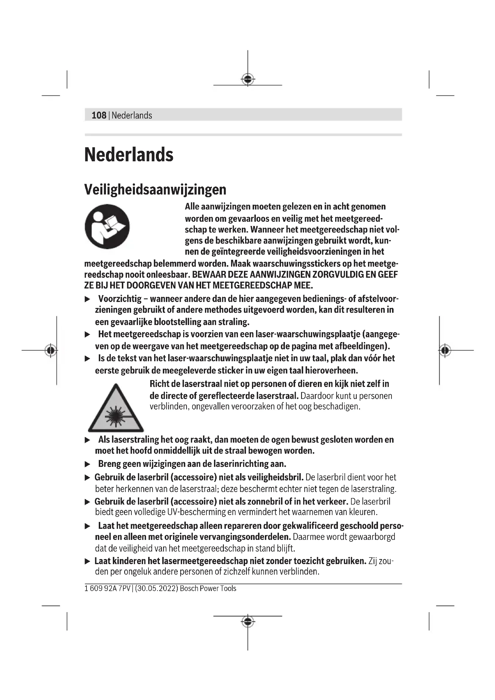 Li-Ion-accu laden u Gebruik voor het opladen een USB-voedingsadapter waarvan de technische gegevens (spanning en laadstroom) overeenkomen met die van de aanbevolen voedingsadapter. Lees hiervoor goed de gebruiksaanwijzing van de USB-voedingsadapter. Aanbevolen voedingsadapter: zie technische gegevens. u Let op de netspanning! De spanning van de stroombron moet overeenkomen met de gegevens op het typeplaatje van de voedingsadapter. Met 230V aangeduide voedings- adapters kunnen ook met 220V worden gebruikt. Lithium-Ion-accu's worden vanwege internationale transportvoorschriften gedeel- telijk geladen geleverd. Om de volledige capaciteit van de accu te verkrijgen, laadt u vóór het eerste gebruik de accu volledig op. Raadpleeg voor aanvullende informatie de online-gebruiksaanwijzing: www.bosch-pt.com/manuals Gebruik Ingebruikname u Laat het ingeschakelde meetgereedschap niet onbeheerd achter en schakel het meetgereedschap na gebruik uit. Andere personen kunnen door de laserstraal ver- blind worden. Bosch Power Tools 1 609 92A 7PV | (30.05.2022)116 | Nederlands u Bescherm het meetgereedschap tegen vocht en fel zonlicht. u Stel het meetgereedschap niet bloot aan extreme temperaturen of temperatuur- schommelingen. Laat het bijv. niet gedurende langere tijd in de auto liggen. Laat het meetgereedschap bij grotere temperatuurschommelingen eerst op temperatuur ko- men, voordat u het in gebruik neemt. Bij extreme temperaturen of temperatuurschom- melingen kan de nauwkeurigheid van het meetgereedschap nadelig beïnvloed worden. u Vermijd krachtige stoten of vallen van het meetgereedschap. Na sterke invloeden van buitenaf op het meetgereedschap moet u vóór het verder werken altijd een nauw- keurigheidscontrole (zie „Nauwkeurigheidscontrole“, Pagina121) uitvoeren. In-/uitschakelen Druk op de toets om het meetgereedschap en de laser in te schakelen. U kunt het meetgereedschap ook zonder de laser inschakelen door op de toets te drukken. Houd de toets ingedrukt om het meetgereedschap uit te schakelen. De in het geheugen aanwezige waarden en toestelinstellingen blijven behouden. Camera Druk op de toets / om de camera in of uit te schakelen. Na het uitschakelen van het meetgereedschap blijft de gekozen toestand opgeslagen. Bij grotere afstanden (ca. > 5m) verschijnt bovendien een doelmarkering om het meet- punt te markeren. Raadpleeg voor aanvullende informatie de online-gebruiksaanwijzing: www.bosch-pt.com/manuals Meetprocedure Na het inschakelen bevindt het meetgereedschap zich in de functie lengtemeting. Als referentievlak voor de meting is na het inschakelen de achterkant van het meetgereed- schap gekozen. U kunt het referentievlak wijzigen. (zie „Referentievlak kiezen“, Pagi- na117) Plaats het meetgereedschap op het gewenste startpunt van de meting (bijv. muur). Druk op de toets om de meting te activeren. 1 609 92A 7PV | (30.05.2022) Bosch Power ToolsNederlands | 117 Na het meten wordt de laserstraal uitgeschakeld. Voor nog een meting herhaalt u deze procedure. Meetwaarden of eindresultaten kunnen opgeteld of afgetrokken worden. Bij ingeschakelde permanente laserstraal en in de functie continumeting begint de meting al na de eerste keer drukken op de toets . De ingeschakelde permanente laserstraal wordt na de meting niet uitgeschakeld Perma- nente laserstraal. Raadpleeg voor aanvullende informatie de online-gebruiksaanwijzing: www.bosch-pt.com/manuals Het meetgereedschap mag tijdens een meting niet worden bewogen. Leg daarom het meetgereedschap indien mogelijk tegen een vast aanslag- of oplegvlak. De ontvangstlens(20), de uitgang van de laserstraal(21) en de camera(22) mo- gen bij een meting niet afgedekt zijn. Referentievlak kiezen Voor de meting kunt u uit verschillende referentievlakken kiezen: de achterkant van het meetgereedschap (bijv. als het tegen een muur wordt ge- legd) de punt van de 180° geklapte aanslagplaat(bijv. voor metingen vanuit hoeken) de voorkant van het meetgereedschap (bijv. bij het meten vanaf de rand van een tafel) het midden van de statiefschroefdraad(19) (bijv. voor metingen met statief) Raadpleeg voor aanvullende informatie de online-gebruiksaanwijzing: www.bosch-pt.com/manuals Menu Basisinstellingen In het menu Basisinstellingen vindt u de volgende basisinstellingen: – Bluetooth® in-/uitschakelen Bosch Power Tools 1 609 92A 7PV | (30.05.2022)118 | Nederlands – Referentievlak wisselen (zie „Referentievlak kiezen“, Pagina117) – Timerfunctie – Permanente laserstraal in-/uitschakelen – Kalibratie hellingmeting (zie „Nauwkeurigheidscontrole“, Pagina121) – Kalibratie doelaanduiding – Geheugen wissen (GLM 150-27 C) – Taal instellen – Datum en tijd instellen – Maateenheid wisselen – Hoekeenheid wisselen – PRO360 activeren – Toestelinformatie opvragen – Geluidssignalen in-/uitschakelen – Uitschakeltijd instellen – Dimtijd instellen – Displayhelderheid instellen – Automatisch beeldscherm draaien in-/uitschakelen Druk kort op de toets of houd de toets ingedrukt om het menu Basisinstellin- gen te openen. Kies de gewenste instelling met de toets of de toets . Om de keuze te bevestigen drukt u op de toets . Om het menu Basisinstellingen te verlaten, drukt u op de toets of op de toets . Raadpleeg voor aanvullende informatie de online-gebruiksaanwijzing: www.bosch-pt.com/manuals 1 609 92A 7PV | (30.05.2022) Bosch Power ToolsNederlands | 119 Meetfuncties Meetfuncties kiezen/wijzigen In het functiemenu vindt u de volgende functies: – Lengtemeting – Oppervlaktemeting – Volumemeting – Indirecte afstandsmeting