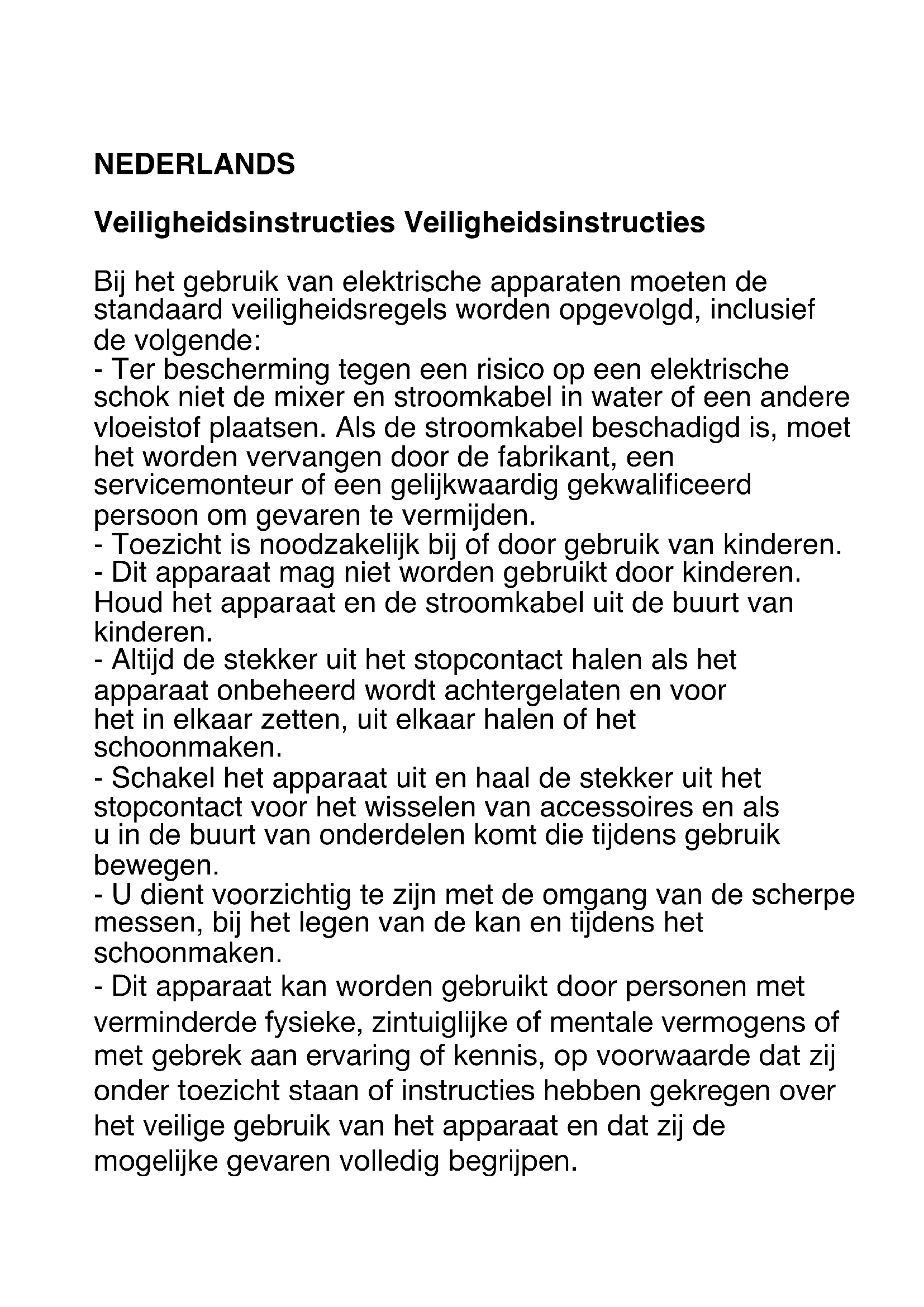 UMWELT BEACHTUNG: Entsorgen Sie dieses Produkt nicht mit anderen Haushaltsgegenständen. Dieses Produkt muss separat bei bestimmten Stellen entsorgt werden, informieren Sie sich bei lokalen Behörden über die Stellen, wohin das Produkt gebracht werden kann. In der Tat, elektrische und elektronische Produkte beinhalten gefährliche Stoffe, die eine schädliche Auswirkung auf die Umwelt und menschliche Gesundheit haben und recycelt werden müssen. Dieses Symbol, dass elektrische und elektronische Geräte vorsichtig gewählt werden müssen, die Rollcontainer werden mit einem Kreuz markiert. Adeva SAS / H.Koenig Europe - 8 rue Marc Seguin, 77290 Mitry-Mory, France www.hkoenig.com - https://kundenservice.hkoenig.com - Tél: +33 1 64 67 00 05NEDERLANDS Veiligheidsinstructies Veiligheidsinstructies Bij het gebruik van elektrische apparaten moeten de standaard veiligheidsregels worden opgevolgd, inclusief de volgende: - Ter bescherming tegen een risico op een elektrische schok niet de mixer en stroomkabel in water of een andere vloeistof plaatsen. Als de stroomkabel beschadigd is, moet het worden vervangen door de fabrikant, een servicemonteur of een gelijkwaardig gekwalificeerd persoon om gevaren te vermijden. - Toezicht is noodzakelijk bij of door gebruik van kinderen. - Dit apparaat mag niet worden gebruikt door kinderen. Houd het apparaat en de stroomkabel uit de buurt van kinderen. - Altijd de stekker uit het stopcontact halen als het apparaat onbeheerd wordt achtergelaten en voor het in elkaar zetten, uit elkaar halen of het schoonmaken. - Schakel het apparaat uit en haal de stekker uit het stopcontact voor het wisselen van accessoires en als u in de buurt van onderdelen komt die tijdens gebruik bewegen. - U dient voorzichtig te zijn met de omgang van de scherpe messen, bij het legen van de kan en tijdens het schoonmaken. - Dit apparaat kan worden gebruikt door personen met verminderde fysieke, zintuiglijke of mentale vermogens of met gebrek aan ervaring of kennis, op voorwaarde dat zij onder toezicht staan of instructies hebben gekregen over het veilige gebruik van het apparaat en dat zij de mogelijke gevaren volledig begrijpen.- Haal de stekker uit het stopcontact als het apparaat niet in gebruik is, voor het plaatsen of verwijderen van onderdelen en voor het schoonmaken. - Vermijd het aanraken van bewegende delen. Houd handen, haar, kleding alsook spatels en andere keukengerei weg van de kloppers tijdens gebruik om de risico's op verwondingen en/of schade aan de mixer te verkleinen. - Gebruik geen apparaten met een beschadigde kabel of stekker of als het apparaat niet goed werkt, gevallen is of op welke manier dan ook beschadigd is. Breng het apparaat naar het dichtstbijzijnde servicemonteur voor onderzoek, reparatie of een mechanische aanpassing. - Het gebruik van reserveonderdelen die niet zijn aanbevolen of verkocht door de fabrikant, kan leiden tot vuur, elektrische schokken of verwondingen. - Niet buiten gebruiken. Dit apparaat is alleen voor huishoudelijk gebruik. - Laat de kabel niet hangen over de rand van een tafel of aanrecht. - Verwijder de kloppers uit de mixer voor het wassen. - Dit apparaat mag gebruikt worden door kinderen van minimaal 8 jaar als er toezicht wordt gehouden en ze instructies hebben gehad over hoe ze het apparaat moeten gebruiken en ze de gevaren begrijpen. - Het schoonmaken en onderhoud mag niet worden uitgevoerd door kinderen tenzij ze 8 jaar of ouder zijn en er toezicht is. - Houd het apparaat en de stroomkabel uit de buurt van kinderen jonger dan 8 jaar. - Bij het gebruik van elektrische apparaten moeten altijd de standaard veiligheidsinstructies worden opgevolgd om de kans op vuur, elektrische schokken en/of verwondingen te voorkomen. - Controleer dat de aangegeven spanning op het typeplaatje overeenkomt met de spanning van uwspanningsbron. Als dit niet het geval is, neem dan contact op met de dealer en sluit het apparaat niet aan. - Bewaar deze handleiding voor toekomstig gebruik en geef hem met het apparaat mee aan toekomstige gebruikers. - Het apparaat is alleen bedoeld voor huishoudelijk en gebruik in huis. - Uw apparaat is uitsluitend ontworpen voor huishoudelijk gebruik. Het is niet bedoeld voor gebruik in de volgende situaties, die niet onder de garantie vallen: - in personeelskeukens in winkels, kantoren en andere professionele omgevingen, - in boerderijherbergen, - door gasten in hotels, motels en andere residentiële omgevingen, - in bed & breakfast-omgevingen.