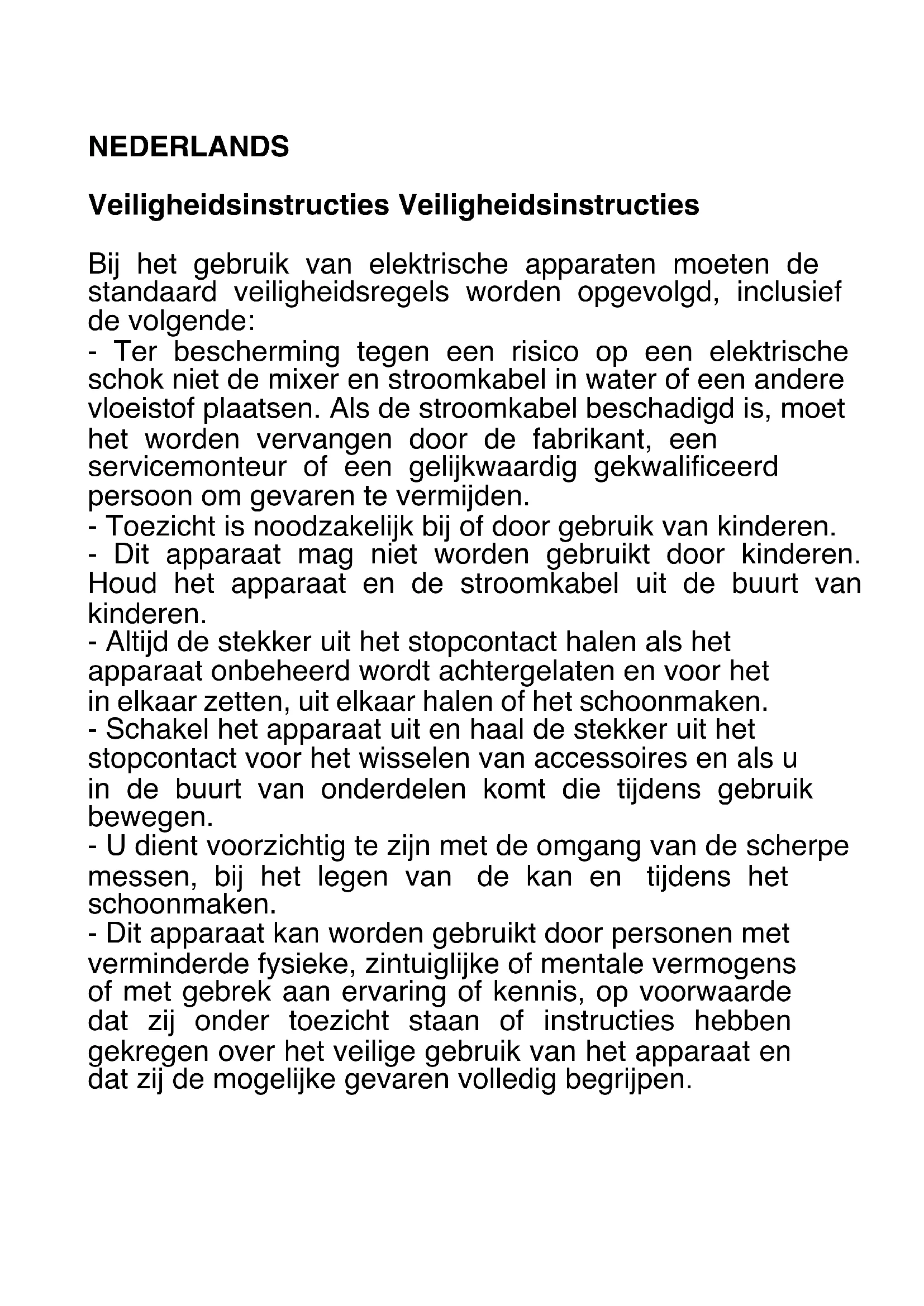 UMWELT BEACHTUNG: Entsorgen Sie dieses Produkt nicht mit anderen Haushaltsgegenständen. Dieses Produkt muss separat bei bestimmten Stellen entsorgt werden, informieren Sie sich bei lokalen Behörden über die Stellen, wohin das Produkt gebracht werden kann. In der Tat, elektrische und elektronische Produkte beinhalten gefährliche Stoffe, die eine schädliche Auswirkung auf die Umwelt und menschliche Gesundheit haben und recycelt werden müssen. Dieses Symbol, dass elektrische und elektronische Geräte vorsichtig gewählt werden müssen, die Rollcontainer werden mit einem Kreuz markiert. Adeva SAS / H.Koenig Europe - 8 rue Marc Seguin, 77290 Mitry-Mory, France www.hkoenig.com - https://kundenservice.hkoenig.com - Tél: +33 1 64 67 00 05NEDERLANDS Veiligheidsinstructies Veiligheidsinstructies Bij het gebruik van elektrische apparaten moeten de standaard veiligheidsregels worden opgevolgd, inclusief de volgende: - Ter bescherming tegen een risico op een elektrische schok niet de mixer en stroomkabel in water of een andere vloeistof plaatsen. Als de stroomkabel beschadigd is, moet het worden vervangen door de fabrikant, een servicemonteur of een gelijkwaardig gekwalificeerd persoon om gevaren te vermijden. - Toezicht is noodzakelijk bij of door gebruik van kinderen. - Dit apparaat mag niet worden gebruikt door kinderen. Houd het apparaat en de stroomkabel uit de buurt van kinderen. - Altijd de stekker uit het stopcontact halen als het apparaat onbeheerd wordt achtergelaten en voor het in elkaar zetten, uit elkaar halen of het schoonmaken. - Schakel het apparaat uit en haal de stekker uit het stopcontact voor het wisselen van accessoires en als u in de buurt van onderdelen komt die tijdens gebruik bewegen. - U dient voorzichtig te zijn met de omgang van de scherpe messen, bij het legen van de kan en tijdens het schoonmaken. - Dit apparaat kan worden gebruikt door personen met verminderde fysieke, zintuiglijke of mentale vermogens of met gebrek aan ervaring of kennis, op voorwaarde dat zij onder toezicht staan of instructies hebben gekregen over het veilige gebruik van het apparaat en dat zij de mogelijke gevaren volledig begrijpen.- Haal de stekker uit het stopcontact als het apparaat niet in gebruik is, voor het plaatsen of verwijderen van onderdelen en voor het schoonmaken. - Vermijd het aanraken van bewegende delen. Houd handen, haar, kleding alsook spatels en andere keukengerei weg van de kloppers tijdens gebruik om de risico's op verwondingen en/of schade aan de mixer te verkleinen. - Gebruik geen apparaten met een beschadigde kabel of stekker of als het apparaat niet goed werkt, gevallen is of op welke manier dan ook beschadigd is. Breng het apparaat naar het dichtstbijzijnde servicemonteur voor onderzoek, reparatie of een mechanische aanpassing. - Het gebruik van reserveonderdelen die niet zijn aanbevolen of verkocht door de fabrikant, kan leiden tot vuur, elektrische schokken of verwondingen. - Niet buiten gebruiken. Dit apparaat is alleen voor huishoudelijk gebruik. - Laat de kabel niet hangen over de rand van een tafel of aanrecht. - Verwijder de kloppers uit de mixer voor het wassen. - Dit apparaat mag gebruikt worden door kinderen van minimaal 8 jaar als er toezicht wordt gehouden en ze instructies hebben gehad over hoe ze het apparaat moeten gebruiken en ze de gevaren begrijpen. - Het schoonmaken en onderhoud mag niet worden uitgevoerd door kinderen tenzij ze 8 jaar of ouder zijn en er toezicht is. - Houd het apparaat en de stroomkabel uit de buurt van kinderen jonger dan 8 jaar. - Bij het gebruik van elektrische apparaten moeten altijd de standaard veiligheidsinstructies worden opgevolgd om de kans op vuur, elektrische schokken en/of verwondingen te voorkomen. - Controleer dat de aangegeven spanning op het typeplaatje overeenkomt met de spanning van uwspanningsbron. Als dit niet het geval is, neem dan contact op met de dealer en sluit het apparaat niet aan. - Bewaar deze handleiding voor toekomstig gebruik en geef hem met het apparaat mee aan toekomstige gebruikers. - Het apparaat is alleen bedoeld voor huishoudelijk en gebruik in huis. - Uw apparaat is uitsluitend ontworpen voor huishoudelijk gebruik. Het is niet bedoeld voor gebruik in de volgende situaties, die niet onder de garantie vallen: - in personeelskeukens in winkels, kantoren en andere professionele omgevingen, - in boerderijherbergen, - door gasten in hotels, motels en andere residentiële omgevingen, - in bed & breakfast-omgevingen.