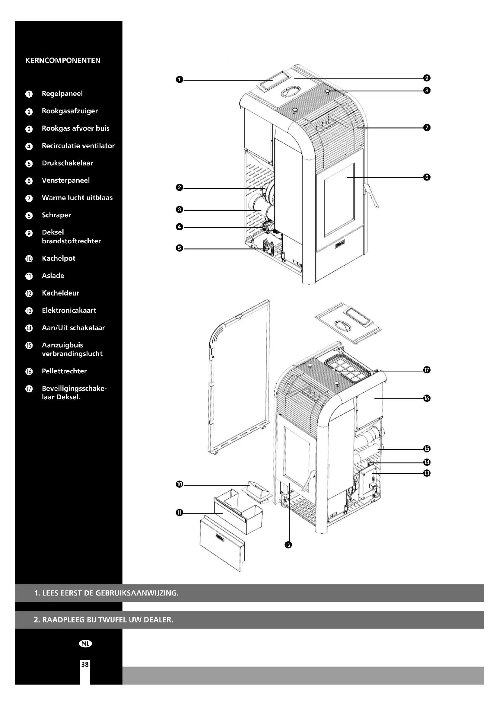 KERNCOMPONENTEN Regelpaneel Rookgasafzuiger Rookgas afvoer buis Recirculatie ventilator Drukschakelaar Vensterpaneel Warme lucht uitblaas Schraper Deksel brandstoftrechter Kachelpot Aslade Kacheldeur Elektronicakaart Aan/Uit schakelaar Aanzuigbuis verbrandingslucht Pellettrechter Beveiligingsschake- laar Deksel.