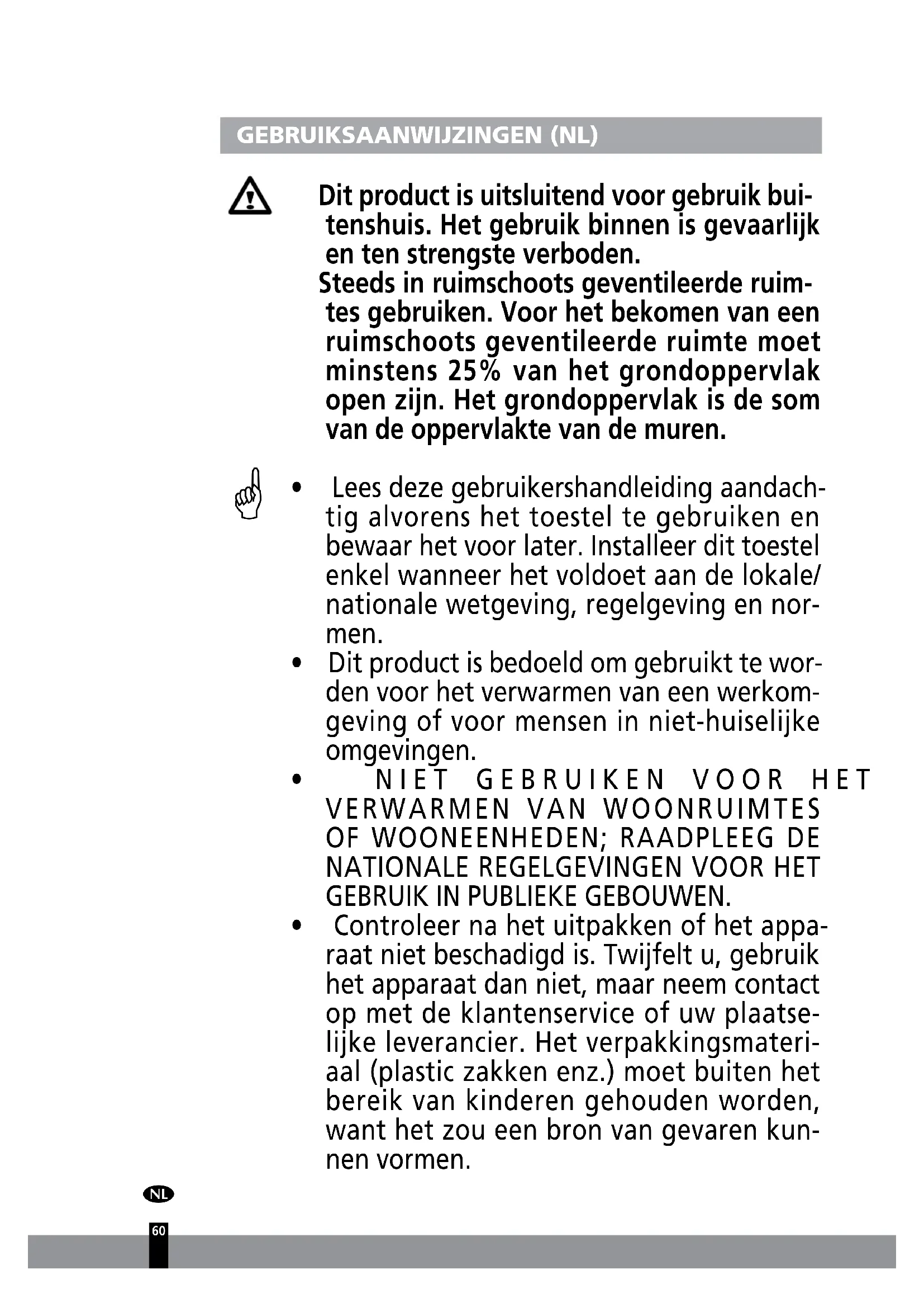 - Dit product is bedoeld om gebruikt te wor- den voor het verwarmen van een werkom- geving of voor mensen in niet-huiselijke omgevingen.