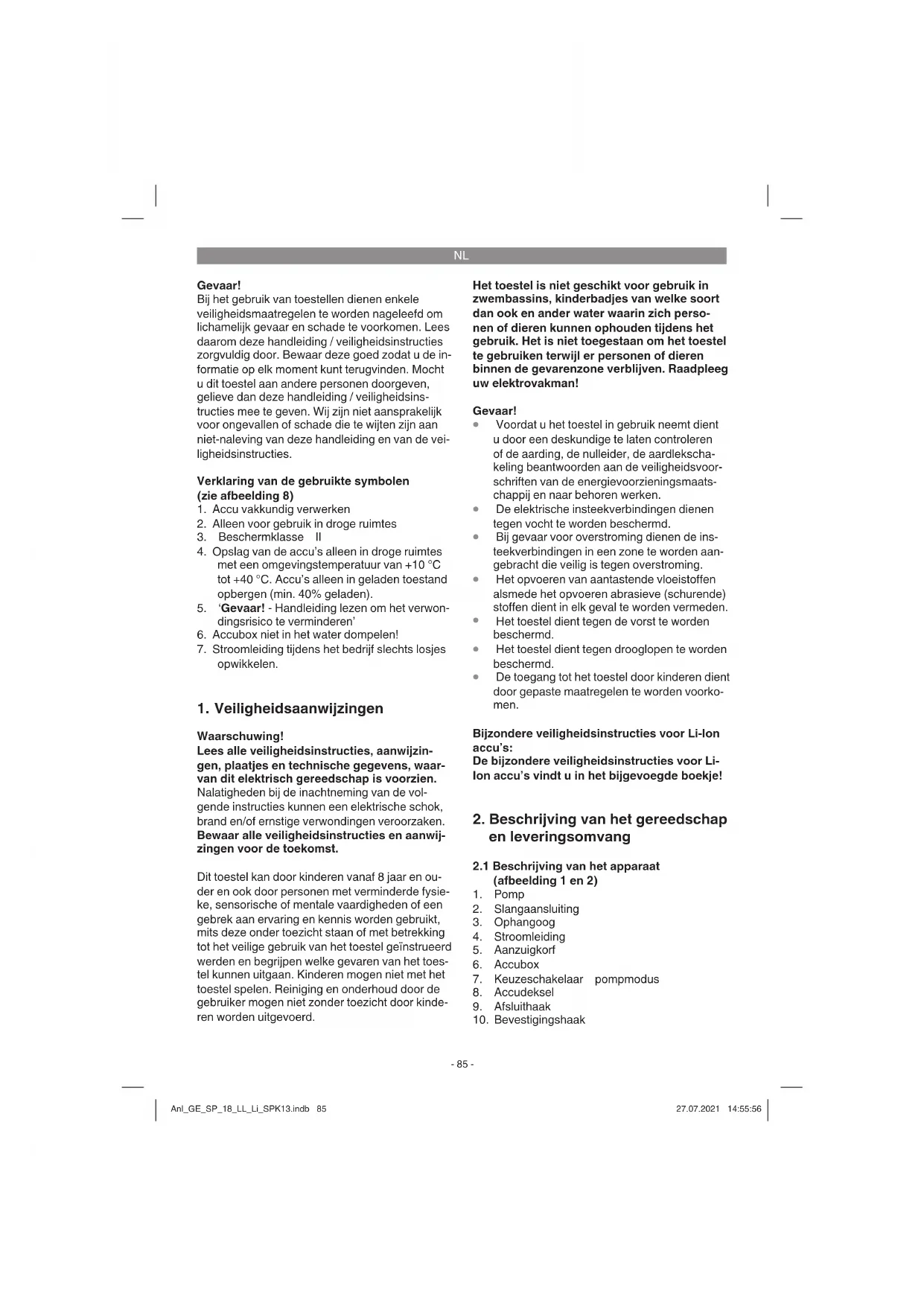 en de accupack op te sturen aan onze klantendienst. Voor een deskundige verzending verzoeken wij u contact op te nemen met onze klan- tendienst of het verkooppunt waar u het ap- paraat heeft aangekocht. Anl_GE_SP_18_LL_Li_SPK13.indb 87Anl_GE_SP_18_LL_Li_SPK13.indb 87 27.07.2021 14:55:5727.07.2021 14:55:57NL