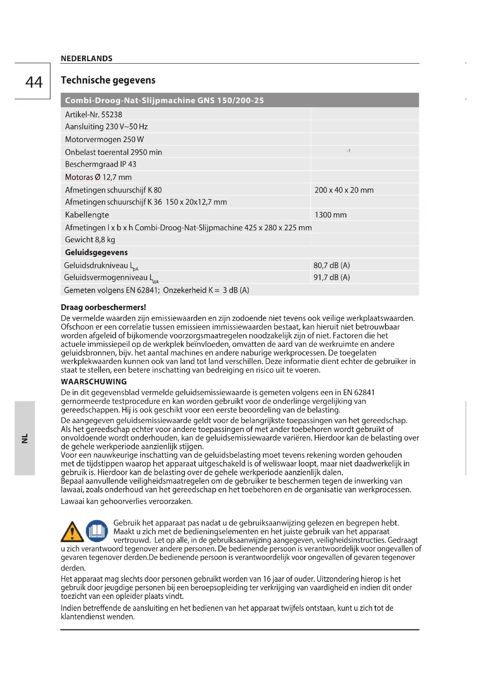 91,7 dB (A) Gemeten volgens EN 62841; Onzekerheid K = 3 dB (A) Draag oorbeschermers! De vermelde waarden zijn emissiewaarden en zijn zodoende niet tevens ook veilige werkplaatswaarden. Ofschoon er een correlatie tussen emissieen immissiewaarden bestaat, kan hieruit niet betrouwbaar worden afgeleid of bijkomende voorzorgsmaatregelen noodzakelijk zijn of niet. Factoren die het actuele immissiepeil op de werkplek beïnvloeden, omvatten de aard van de werkruimte en andere geluidsbronnen, bijv. het aantal machines en andere naburige werkprocessen. De toegelaten werkplekwaarden kunnen ook van land tot land verschillen. Deze informatie dient echter de gebruiker in staat te stellen, een betere inschatting van bedreiging en risico uit te voeren. WAARSCHUWING De in dit gegevensblad vermelde geluidsemissiewaarde is gemeten volgens een in EN62841 gernormeerde testprocedure en kan worden gebruikt voor de onderlinge vergelijking van gereedschappen. Hij is ook geschikt voor een eerste beoordeling van de belasting. De aangegeven geluidsemissiewaarde geldt voor de belangrijkste toepassingen van het gereedschap. Als het gereedschap echter voor andere toepassingen of met ander toebehoren wordt gebruikt of onvoldoende wordt onderhouden, kan de geluidsemissiewaarde variëren. Hierdoor kan de belasting over de gehele werkperiode aanzienlijk stijgen. Voor een nauwkeurige inschatting van de geluidsbelasting moet tevens rekening worden gehouden met de tijdstippen waarop het apparaat uitgeschakeld is of weliswaar loopt, maar niet daadwerkelijk in gebruik is. Hierdoor kan de belasting over de gehele werkperiode aanzienlijk dalen. Bepaal aanvullende veiligheidsmaatregelen om de gebruiker te beschermen tegen de inwerking van lawaai, zoals onderhoud van het gereedschap en het toebehoren en de organisatie van werkprocessen. Lawaai kan gehoorverlies veroorzaken. Gebruik het apparaat pas nadat u de gebruiksaanwijzing gelezen en begrepen hebt. Maakt u zich met de bedieningselementen en het juiste gebruik van het apparaat vertrouwd. Let op alle, in de gebruiksaanwijzing aangegeven, veiligheidsinstructies. Gedraagt u zich verantwoord tegenover andere personen. De bedienende persoon is verantwoordelijk voor ongevallen of gevaren tegenover derden.De bedienende persoon is verantwoordelijk voor ongevallen of gevaren tegenover derden. Het apparaat mag slechts door personen gebruikt worden van 16 jaar of ouder. Uitzondering hierop is het gebruik door jeugdige personen bij een beroepsopleiding ter verkrijging van vaardigheid en indien dit onder toezicht van een opleider plaats vindt. Indien betreende de aansluiting en het bedienen van het apparaat twijfels ontstaan, kunt u zich tot de klantendienst wenden. NEDERLANDS45