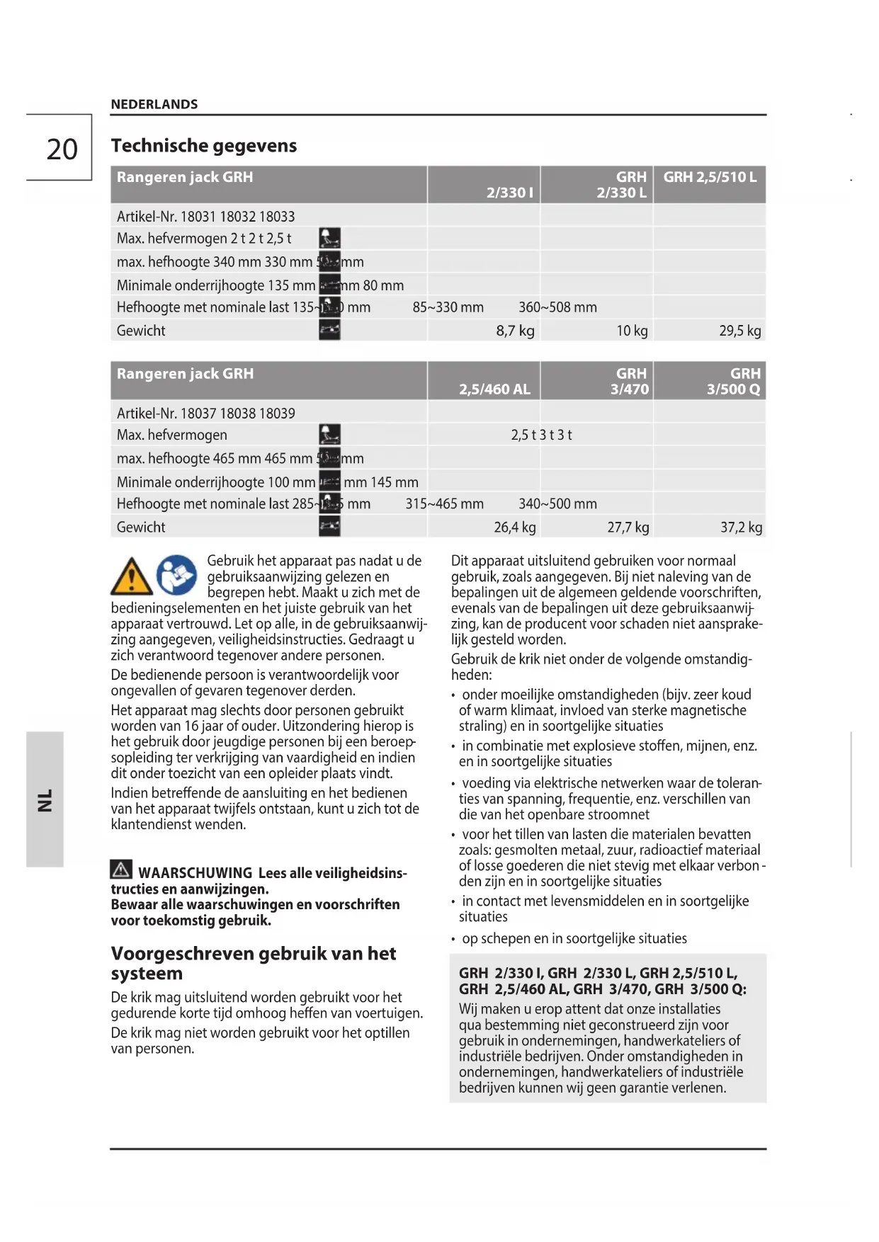 NEDERLANDS Technische gegevens Rangeren jack GRH 2/330 I GRH 2/330 L GRH 2,5/510 L Artikel-Nr. 18031 18032 18033 Max. hefvermogen 2 t 2 t 2,5 t max. hefhoogte 340 mm 330 mm 508 mm Minimale onderrijhoogte 135 mm 85 mm 80 mm Hefhoogte met nominale last 135~340 mm 85~330 mm 360~508 mm Gewicht 8,7 kg 10 kg 29,5 kg Rangeren jack GRH 2,5/460 AL GRH 3/470 GRH 3/500 Q Artikel-Nr. 18037 18038 18039 Max. hefvermogen 2,5 t 3 t 3 t max. hefhoogte 465 mm 465 mm 500 mm Minimale onderrijhoogte 100 mm 130 mm 145 mm Hefhoogte met nominale last 285~465 mm 315~465 mm 340~500 mm Gewicht 26,4 kg 27,7 kg 37,2 kg Gebruik het apparaat pas nadat u de gebruiksaanwijzing gelezen en begrepen hebt. Maakt u zich met de bedieningselementen en het juiste gebruik van het apparaat vertrouwd. Let op alle, in de gebruiksaanwij- zing aangegeven, veiligheidsinstructies. Gedraagt u zich verantwoord tegenover andere personen. De bedienende persoon is verantwoordelijk voor ongevallen of gevaren tegenover derden. Het apparaat mag slechts door personen gebruikt worden van 16 jaar of ouder. Uitzondering hierop is het gebruik door jeugdige personen bij een beroep