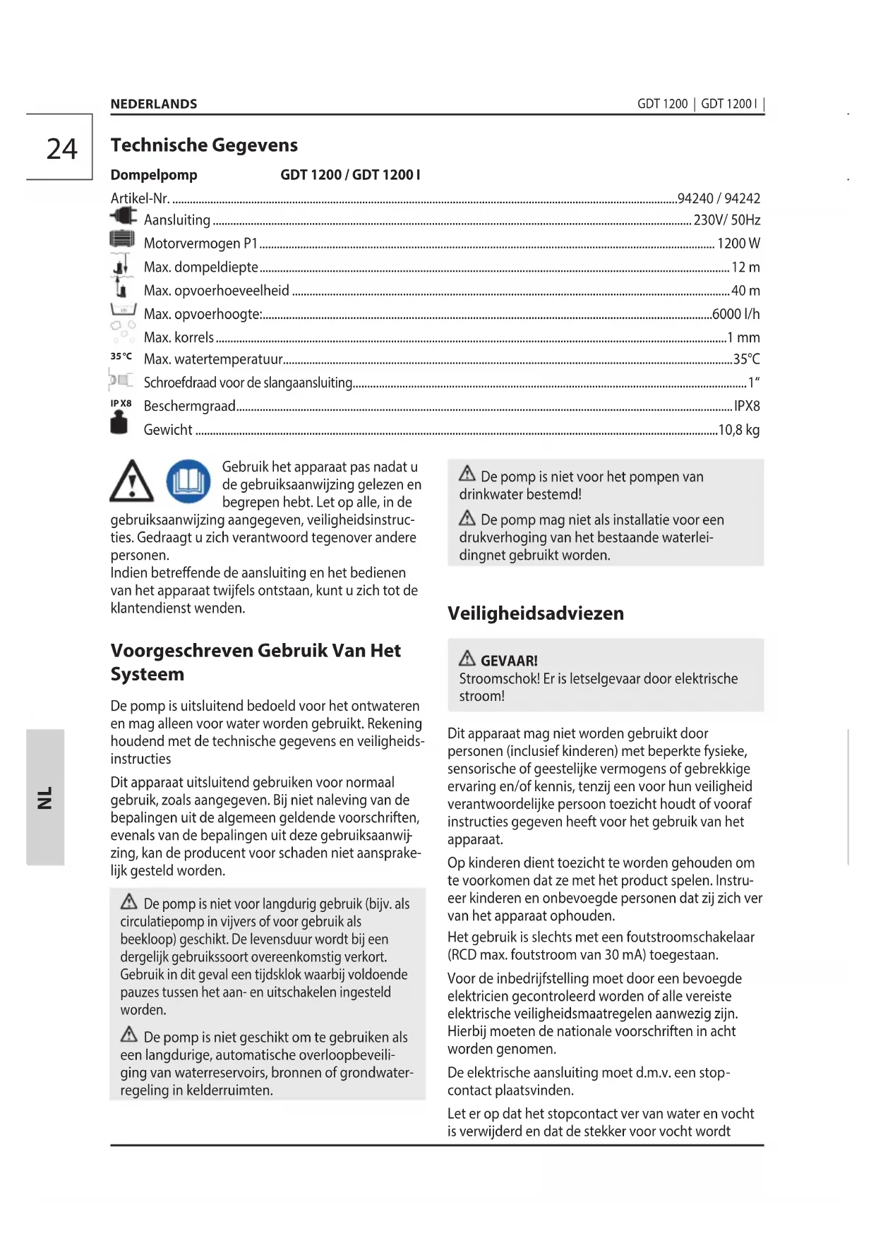 zing, kan de producent voor schaden niet aansprake- lijk gesteld worden. De pomp is niet voor langdurig gebruik (bijv. als circulatiepomp in vijvers of voor gebruik als beekloop) geschikt. De levensduur wordt bij een dergelijk gebruikssoort overeenkomstig verkort. Gebruik in dit geval een tijdsklok waarbij voldoende pauzes tussen het aan- en uitschakelen ingesteld worden. De pomp is niet geschikt om te gebruiken als een langdurige, automatische overloopbeveili- ging van waterreservoirs, bronnen of grondwater- regeling in kelderruimten. Technische Gegevens Dompelpomp GDT 1200 / GDT 1200 I Artikel-Nr. .............................................................................................................................................................................94240 / 94242 Aansluiting .................................................................................................................................................................... 230V/ 50Hz Motorvermogen P1 ............................................................................................................................................................ 1200 W Max. dompeldiepte .................................................................................................................................................................12 m Max. opvoerhoeveelheid ......................................................................................................................................................40 m Max. opvoerhoogte: ..........................................................................................................................................................6000 l/h Max. korrels ...............................................................................................................................................................................1 mm Max. watertemperatuur..........................................................................................................................................................35°C Schroefdraad voor de slangaansluiting ....................................................................................................................................... 1“ Beschermgraad ..........................................................................................................................................................................IPX8 Gewicht ...................................................................................................................................................................................10,8 kg De pomp is niet voor het pompen van drinkwater bestemd! De pomp mag niet als installatie voor een drukverhoging van het bestaande waterlei- dingnet gebruikt worden. Veiligheidsadviezen GEVAAR! Stroomschok! Er is letselgevaar door elektrische stroom! Dit apparaat mag niet worden gebruikt door personen (inclusief kinderen) met beperkte fysieke, sensorische of geestelijke vermogens of gebrekkige ervaring en/of kennis, tenzij een voor hun veiligheid verantwoordelijke persoon toezicht houdt of vooraf instructies gegeven heeft voor het gebruik van het apparaat. Op kinderen dient toezicht te worden gehouden om te voorkomen dat ze met het product spelen. Instru