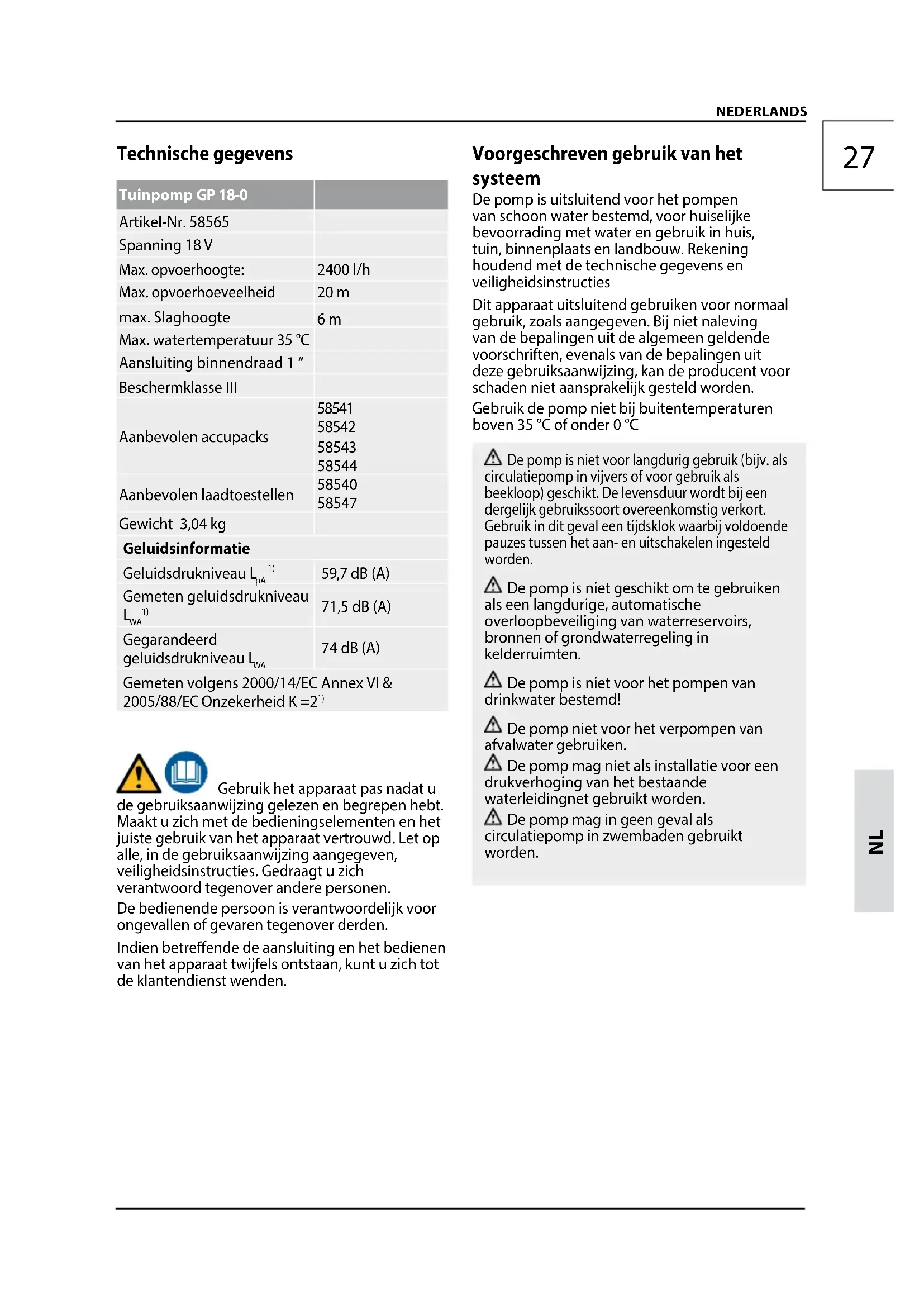 NEDERLANDS Technische gegevens Tuinpomp GP 18-0 Artikel-Nr. 58565 Spanning 18 V Max. opvoerhoogte: 2400 l/h Max. opvoerhoeveelheid 20 m max. Slaghoogte 6 m Max. watertemperatuur 35 °C Aansluiting binnendraad 1 “ Beschermklasse III Aanbevolen accupacks