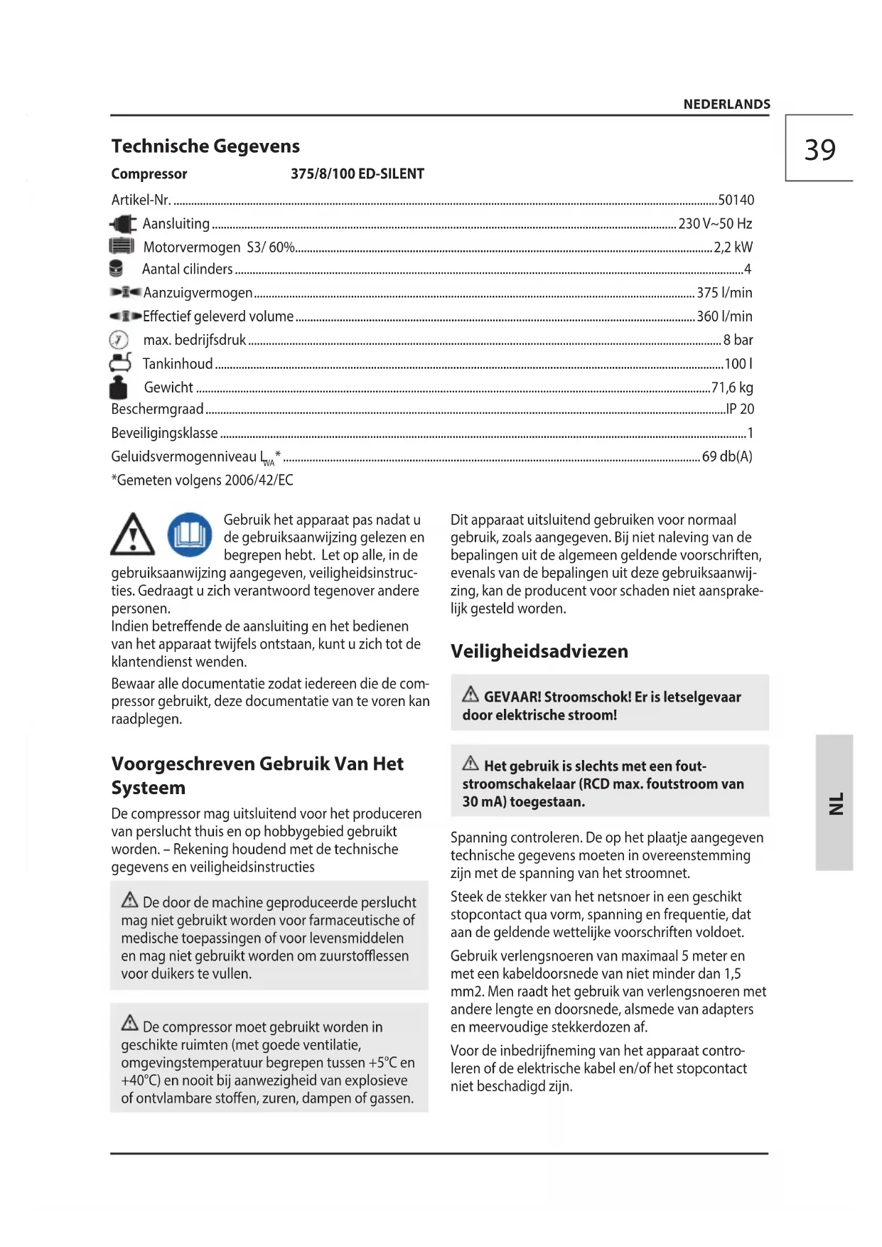 leren of de elektrische kabel en/of het stopcontact niet beschadigd zijn. Technische Gegevens Compressor 375/8/100 ED-SILENT40 Houd altijd een veiligheidsafstand van minstens 4 meter tussen de compressor en de werkzone aan. Let op! Heen en weer slaande persluchtslang bij het openen van de snelkoppeling! - Persluchtslang goed vasthouden. Gebruik altijd en uitsluitend de handgreep om de compressor te verplaatsen. Het gebruik van perslucht voor de verschillende toegestane gebruiksmogelijkheden (opblazen, pneumatische gereedschappen, verfspuiten, wassen met reinigingsmiddelen uitsluitend op waterbasis, nieten, etc.) brengt de kennis en de inachtneming van de voorschriften die in de afzonderlijke gevallen zijn voorzien, met zich mee. Deze compressor is gebouwd om met intermitterend bedrijf, zoals aangegeven op het plaatje met tech