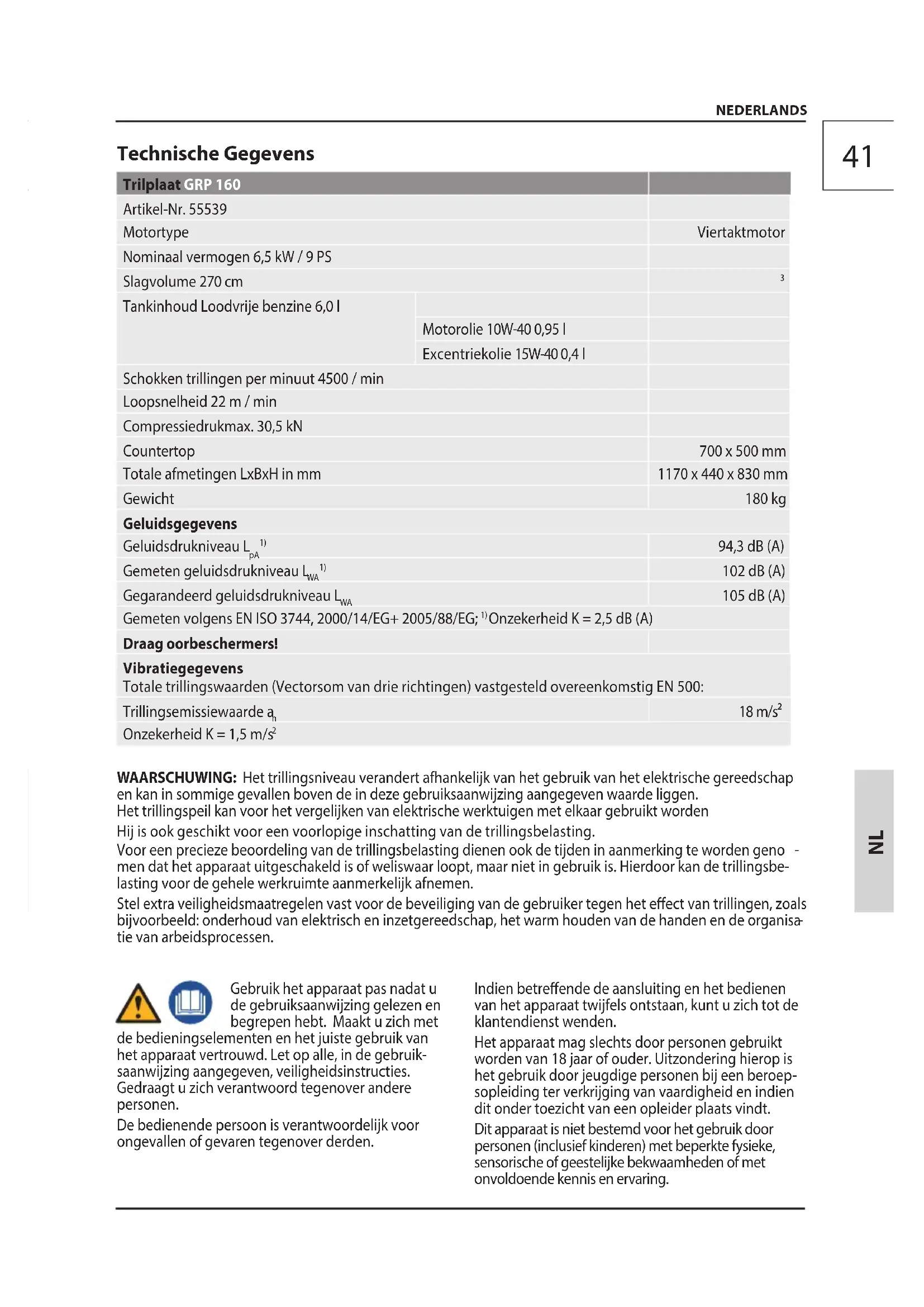 Op kinderen moet gelet worden dat zij niet met het apparaat spelen. Voorgeschreven Gebruik Van Het Systeem De trilplaat is uitsluitend bedoeld voor het verdichten van kleinere tot middelgrote oppervlakken, kleine fundamenten, terrassen, voetpaden en inritten met de volgende materialen: Zand, Grind, Steengruis, Split, Asfalt, Licht bindend gemengd materiaal Met rubberen mat: Straatstenen, Bakstenen De machine mag alleen gebruikt worden op bouwplaatsen, waar de gebruiksomstandigheden van de bouwplaats het gepaste gebruik van de machine toelaten. Plaats het apparaat altijd op een vaste en vlakke ondergrond! Let erop, dat het apparaat tijdens het gebruik niet kantelt, wegglijdt of valt. Houd altijd voldoende afstand tot bouwputranden en bermen. Het apparaat mag niet op een helling gebruikt worden. Gebruik het apparaat niet in een explosiegevaar