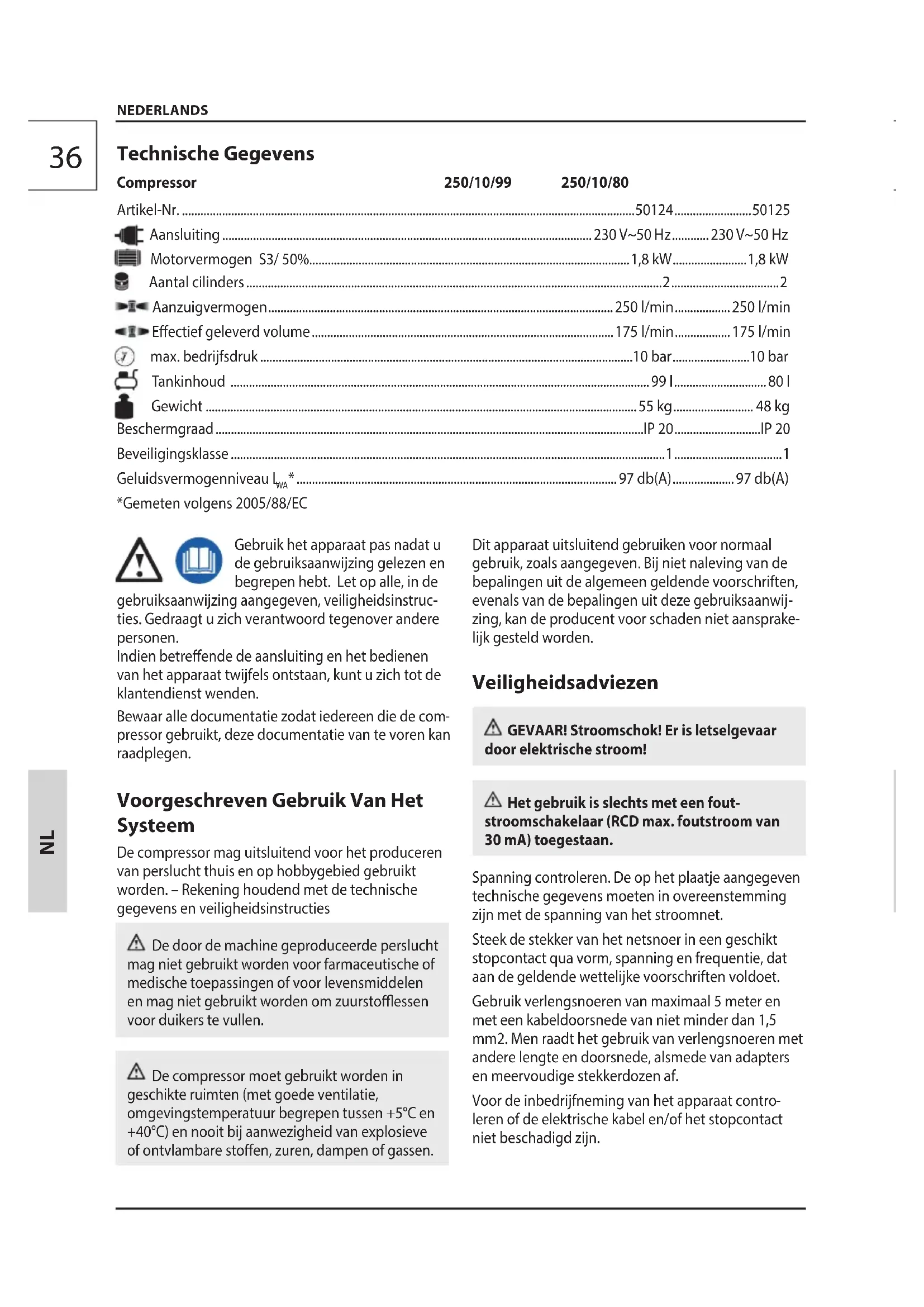 - ........................................................................................................ 97 db(A) ....................97 db(A) *Gemeten volgens 2005/88/EC Technische Gegevens Compressor 250/10/99 250/10/8037 Houd altijd een veiligheidsafstand van minstens 4 meter tussen de compressor en de werkzone aan. Let op! Heen en weer slaande persluchtslang bij het openen van de snelkoppeling! - Persluchtslang goed vasthouden. Gebruik altijd en uitsluitend de handgreep om de compressor te verplaatsen. Het gebruik van perslucht voor de verschillende toegestane gebruiksmogelijkheden (opblazen, pneumatische gereedschappen, verfspuiten, wassen met reinigingsmiddelen uitsluitend op waterbasis, nieten, etc.) brengt de kennis en de inachtneming van de voorschriften die in de afzonderlijke gevallen zijn voorzien, met zich mee. Deze compressor is gebouwd om met intermitterend bedrijf, zoals aangegeven op het plaatje met tech