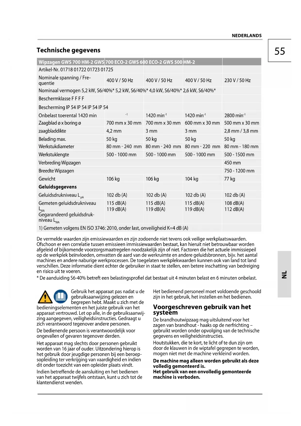 - Geluidsemissie: Beslist gehoorbeschermer dragen.