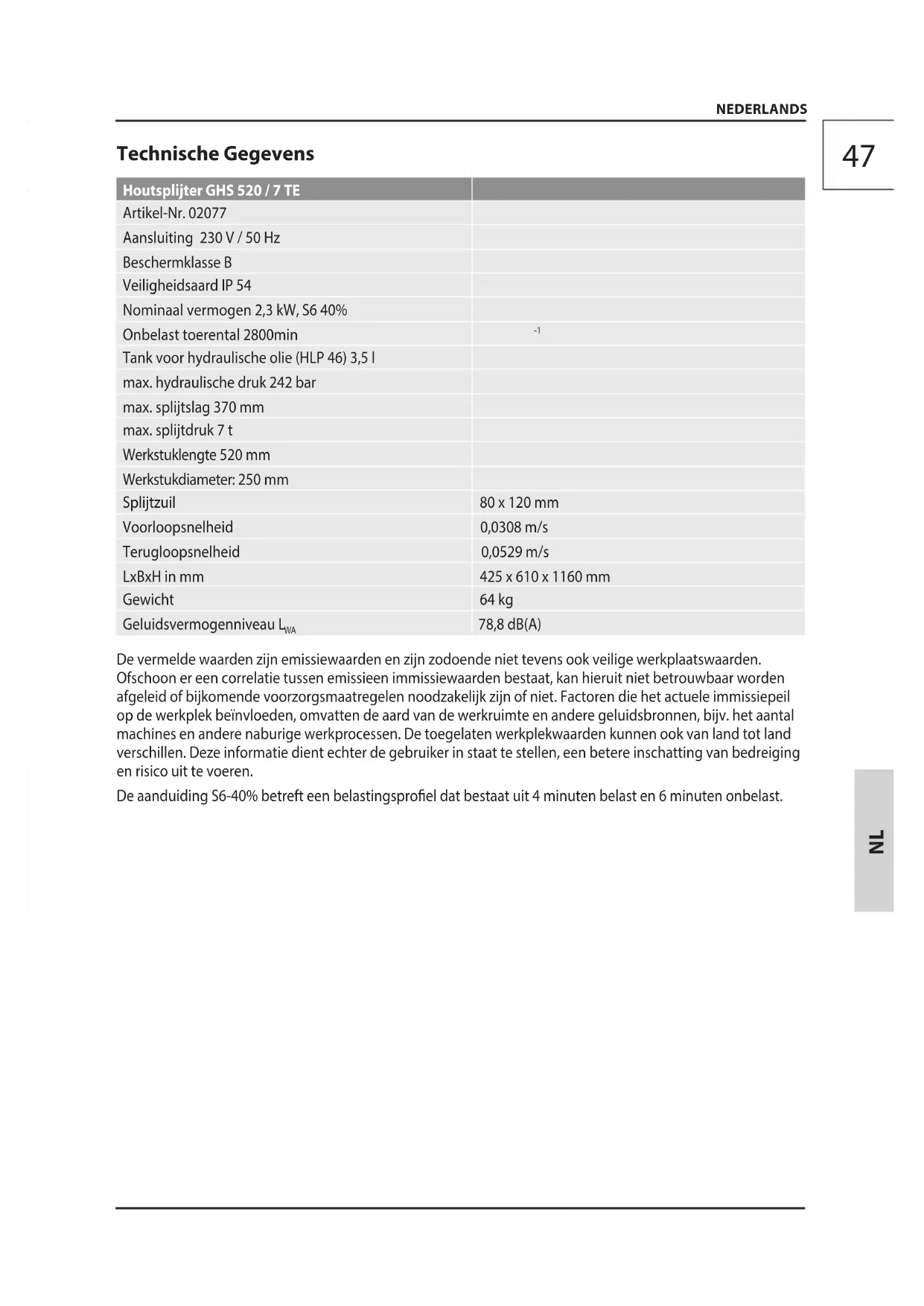 sopleiding ter verkrijging van vaardigheid en indien dit onder toezicht van een opleider plaats vindt. Indien betreende de aansluiting en het bedienen van het apparaat twijfels ontstaan, kunt u zich tot de klantendienst wenden. Het bedienend personeel moet voldoende geschoold zijn in het gebruik, het instellen en het bedienen. Voorgeschreven Gebruik Van Het Systeem De houtsplijter is uitsluitend bestemd voor het klein maken van brandhout en wel in de draadrichting. Rekening houdend met de technische gegevens en veiligheidsinstructies De machine mag alleen worden gebruikt als deze volledig gemonteerd is. Het gebruik van een onvolledig gemonteerde machine is verboden. Het apparaat mag niet worden gebruikt zonder de bijvoegtafel. De aanwijzingen betreende montage, gebruik, onderhoud en reparatie e.d. dienen opgevolgd te worden om gevaren uit te sluiten en schaden te vermijden. Let er op dat dit apparaat niet voor industriële toe