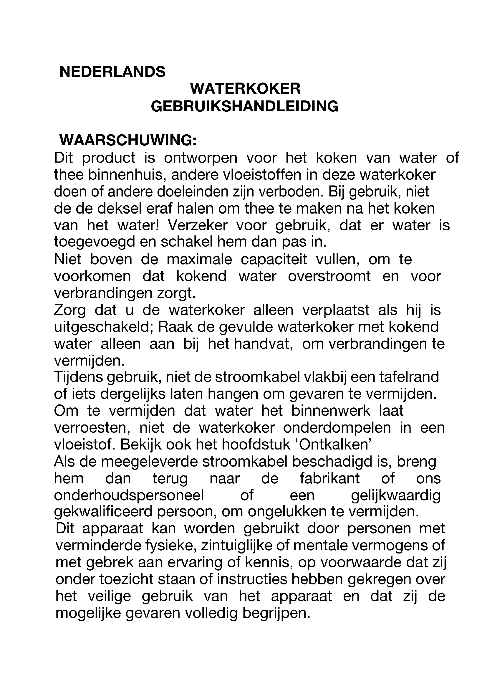Adeva SAS / H.Koenig Europe - 8 rue Marc Seguin, 77290 Mitry-Mory, France www.hkoenig.com - https://kundenservice.hkoenig.com - Tél: +33 1 64 67 00 05NEDERLANDS WATERKOKER GEBRUIKSHANDLEIDING WAARSCHUWING: Dit product is ontworpen voor het koken van water of thee binnenhuis, andere vloeistoffen in deze waterkoker doen of andere doeleinden zijn verboden. Bij gebruik, niet de de deksel eraf halen om thee te maken na het koken van het water! Verzeker voor gebruik, dat er water is toegevoegd en schakel hem dan pas in. Niet boven de maximale capaciteit vullen, om te voorkomen dat kokend water overstroomt en voor verbrandingen zorgt. Zorg dat u de waterkoker alleen verplaatst als hij is uitgeschakeld; Raak de gevulde waterkoker met kokend water alleen aan bij het handvat, om verbrandingen te vermijden. Tijdens gebruik, niet de stroomkabel vlakbij een tafelrand of iets dergelijks laten hangen om gevaren te vermijden. Om te vermijden dat water het binnenwerk laat verroesten, niet de waterkoker onderdompelen in een vloeistof. Bekijk ook het hoofdstuk 'Ontkalken’ Als de meegeleverde stroomkabel beschadigd is, breng hem dan terug naar de fabrikant of ons onderhoudspersoneel of een gelijkwaardig gekwalificeerd persoon, om ongelukken te vermijden. Dit apparaat kan worden gebruikt door personen met verminderde fysieke, zintuiglijke of mentale vermogens of met gebrek aan ervaring of kennis, op voorwaarde dat zij onder toezicht staan of instructies hebben gekregen over het veilige gebruik van het apparaat en dat zij de mogelijke gevaren volledig begrijpen.Kinderen moeten onder toezicht worden gehouden, om te verzekeren dat ze niet met het apparaat spelen. Dit apparaat is bedoeld voor gebruik in huishoudens en soortgelijke ruimten, zoals - keukenruimten in winkels, kantoren en andere werkomgevingen - in boerderijen - in hotels, motels en andere woonwijken - gastenkamers. Als de waterkoker te vol is, kan kokend water overstromen. Het apparaat mag niet ondergedompeld worden. De waterkoker mag alleen gebruikt worden met de meegeleverde basis Het apparaat mag niet worden gebruikt als het is gevallen, er zijn duidelijke tekenen van schade zichtbaar of er zijn lekken.