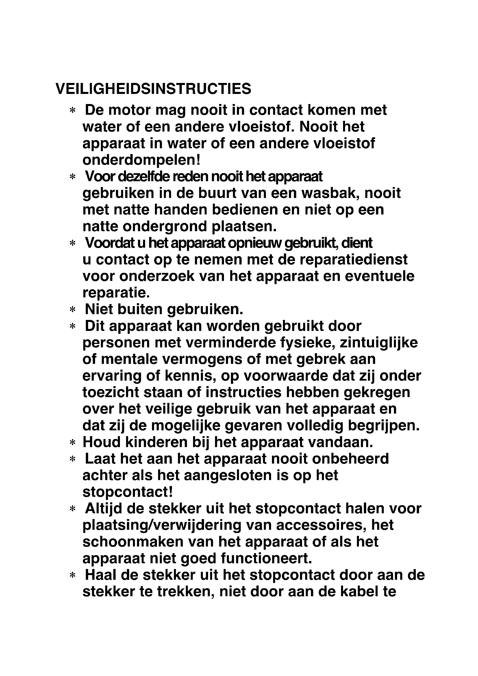 - De motor mag nooit in contact komen met water of een andere vloeistof. Nooit het apparaat in water of een andere vloeistof onderdompelen!