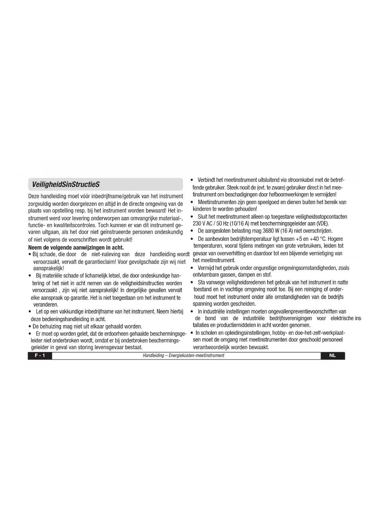 mF - 1 Handleiding – Energiekosten-meetinstrument NL VeiligheidSinStructieS Deze handleiding moet vóór inbedrijfname/gebruik van het instrument zorgvuldig worden doorgelezen en altijd in de directe omgeving van de plaats van opstelling resp. bij het instrument worden bewaard! Het in- strument werd voor levering onderworpen aan omvangrijke materiaal-, functie- en kwaliteitscontroles. Toch kunnen er van dit instrument ge- varen uitgaan, als het door niet geïnstrueerde personen ondeskundig of niet volgens de voorschriften wordt gebruikt! Neem de volgende aanwijzingen in acht.