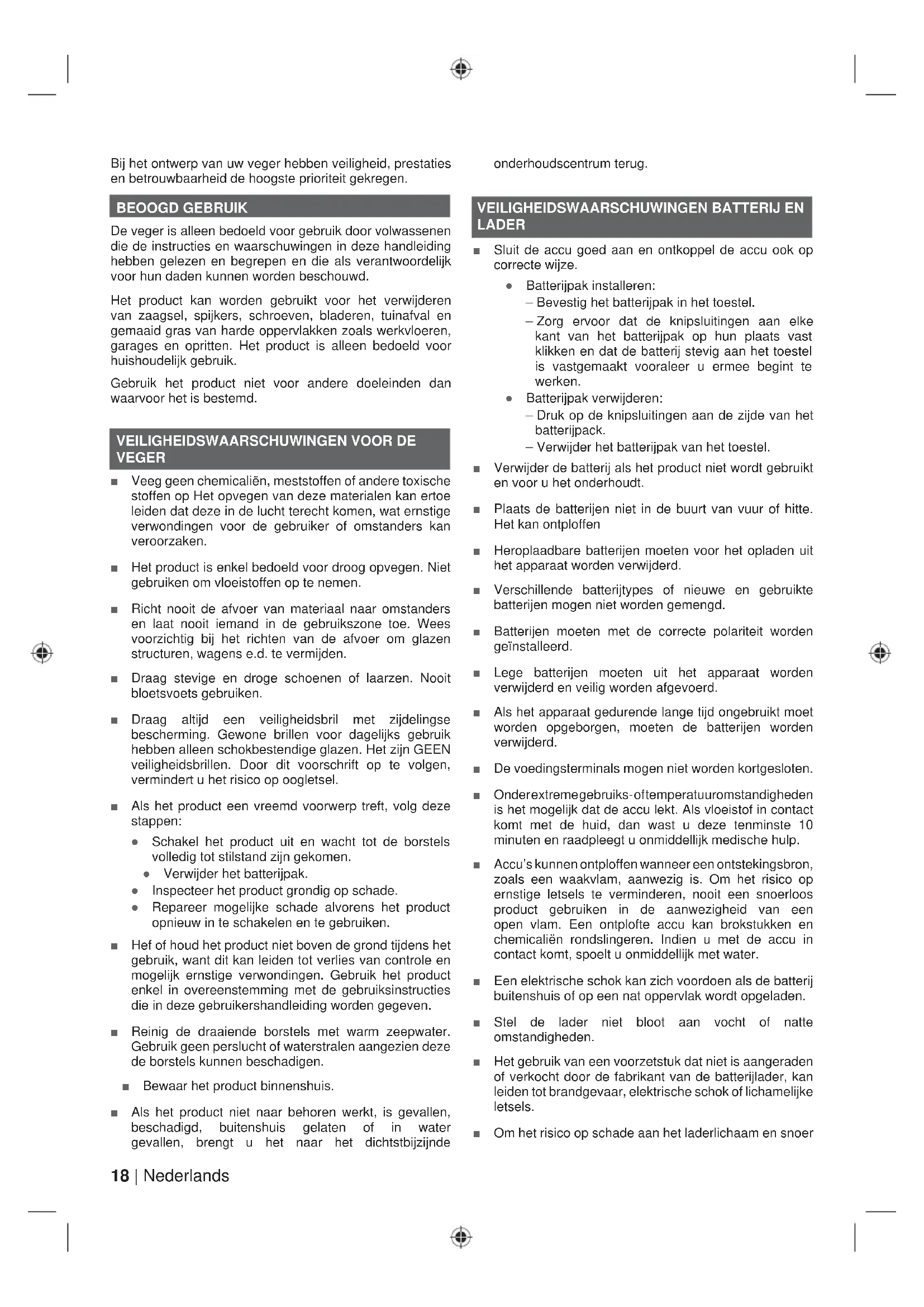 VEGER Ŷ Veeg geen chemicaliën, meststoffen of andere toxische stoffen op Het opvegen van deze materialen kan ertoe leiden dat deze in de lucht terecht komen, wat ernstige verwondingen voor de gebruiker of omstanders kan veroorzaken. Ŷ Het product is enkel bedoeld voor droog opvegen. Niet gebruiken om vloeistoffen op te nemen. Ŷ Richt nooit de afvoer van materiaal naar omstanders en laat nooit iemand in de gebruikszone toe. Wees voorzichtig bij het richten van de afvoer om glazen structuren, wagens e.d. te vermijden. Ŷ Draag stevige en droge schoenen of laarzen. Nooit bloetsvoets gebruiken. Ŷ Draag altijd een veiligheidsbril met zijdelingse bescherming. Gewone brillen voor dagelijks gebruik hebben alleen schokbestendige glazen. Het zijn GEEN veiligheidsbrillen. Door dit voorschrift op te volgen, vermindert u het risico op oogletsel. Ŷ Als het product een vreemd voorwerp treft, volg deze stappen: Ɣ Schakel het product uit en wacht tot de borstels volledig tot stilstand zijn gekomen. Ɣ Verwijder het batterijpak. Ɣ Inspecteer het product grondig op schade. Ɣ Repareer mogelijke schade alvorens het product opnieuw in te schakelen en te gebruiken. Ŷ Hef of houd het product niet boven de grond tijdens het gebruik, want dit kan leiden tot verlies van controle en mogelijk ernstige verwondingen. Gebruik het product enkel in overeenstemming met de gebruiksinstructies die in deze gebruikershandleiding worden gegeven. Ŷ Reinig de draaiende borstels met warm zeepwater. Gebruik geen perslucht of waterstralen aangezien deze de borstels kunnen beschadigen. Ŷ Bewaar het product binnenshuis. Ŷ Als het product niet naar behoren werkt, is gevallen, beschadigd, buitenshuis gelaten of in water gevallen, brengt u het naar het dichtstbijzijnde onderhoudscentrum terug.