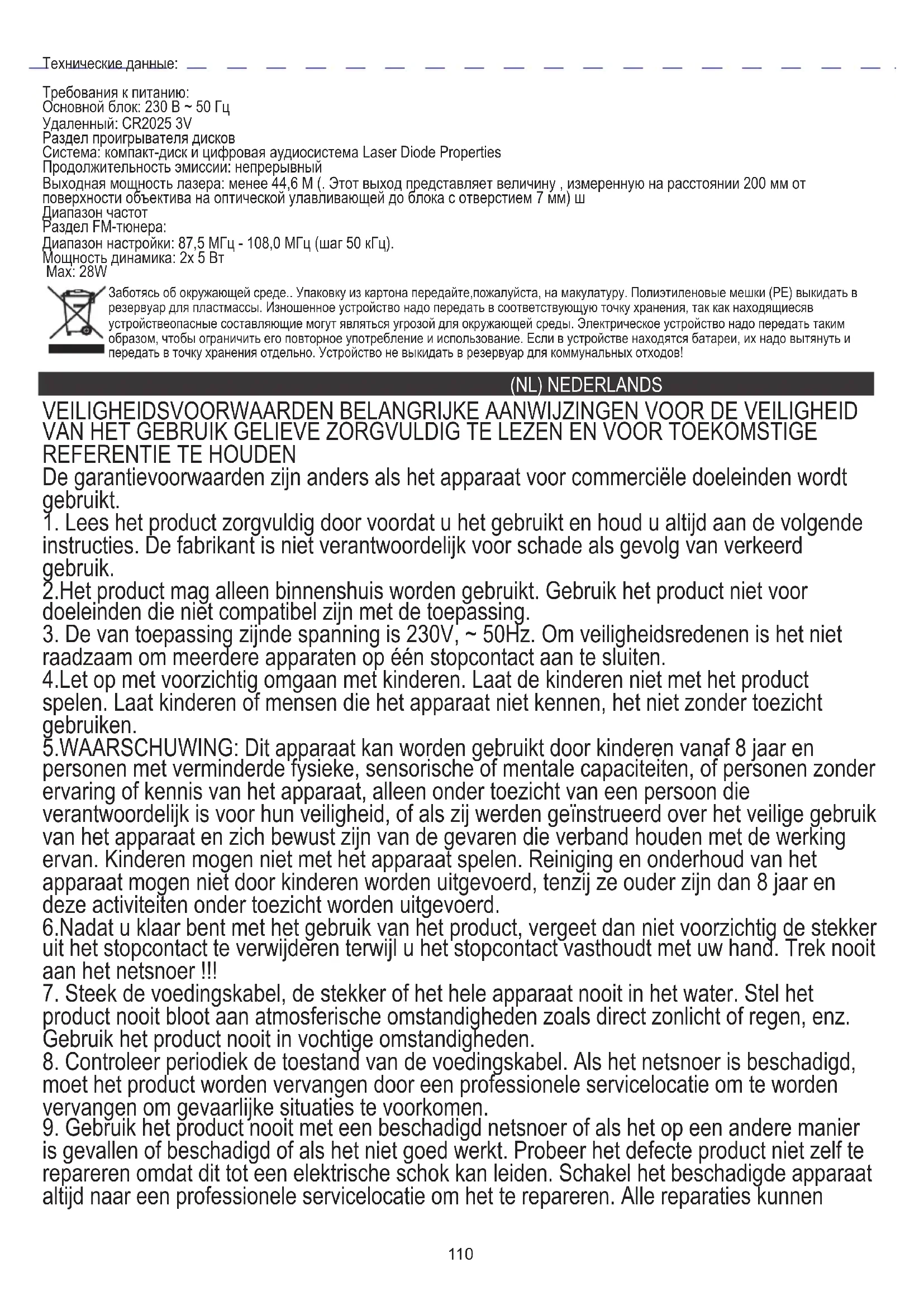- Als het voorpaneel vuil of vlekkerig wordt met vingerafdrukken, kan het worden schoongemaakt met een zachte doek die lichtjes is bevochtigd met een milde zeep- en wateroplossing. Gebruik nooit schurende doeken of poetsmiddelen, omdat deze de afwerking van uw apparaat beschadigen. LET OP: Zorg ervoor dat er tijdens het schoonmaken nooit water of andere vloeistoffen in het apparaat komen Technische data:117 We geven om het milieu. We vragen u om de kartonnen verpakkingen te storten bij het oud papier. Polyethyleen zakken (PE) storten in de container voor plastic . Versleten apparatuur afgeven bij het juiste verzamelpunkt, als in het apparatuur gevaarlijke elementen zitten kan dat een bedreiging zijn voor het milieu. Elektrisch apparatuur moet worden geretourneerd om het hergebruik te verminderen. Als in het apparatur batterijen ziiten, horen die verwijderd te worden en appart af te worden gegeven bij het juiste verzamelpunkt.