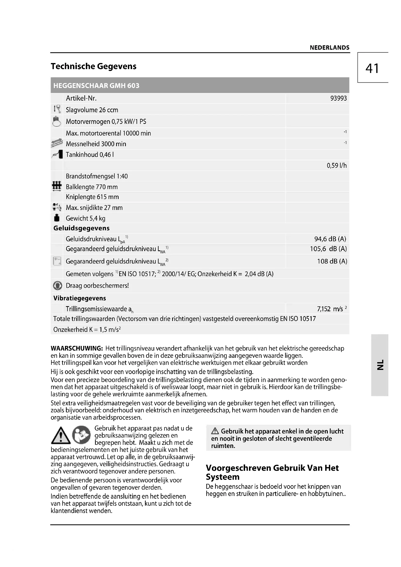 Symbolen Waarschuwing/Let op! Voor verlaging van een letselrisico de gebruiksaanwijzing lezen. Veiligheidsbril dragen! Draag oorbeschermers! Veiligheidshelm dragen! Veiligheidsschoenen met bescherming tegen insnijden, geribde zolen en stalen neuzen dragen! Veiligheidshandschoenen dragen! Langzaam Snel Kracht gebruiken Vóór alle werkzaamheden aan het apparaat de motor uitschakelen en de bougiestekker uitnemen. Waarschuwing voor snijletsels Waarschuwing voor vallende delen Houd in de omgeving staande personen op een veilige afstand van de machine (minimaal 10 m) Waarschuwing voor hete oppervlakken! Verbrandingsgevaar! Waarschuwing voor gevaarlijke elektri- sche spanning VOORZICHTIG! Explosiegevaar! Risico van vergiftiging! Gebruik het apparaat enkel in de open lucht en nooit in gesloten of slecht geven- tileerde ruimten. Tegen vocht beschermen. Stel de machi- ne niet bloot aan regen. Roken en open vuur verboden. Vóór alle werkzaamheden aan het apparaat de motor uitschakelen. Niet met te grote kracht Motortank enkel met uitgeschakelde motor vullen. 60,9 kW/1,2 PSMIX0,4 l/1:40Baujahr: 2014Serien-Nr.: xxxxx-xxxx-xxxx Art.-Nr : 93998