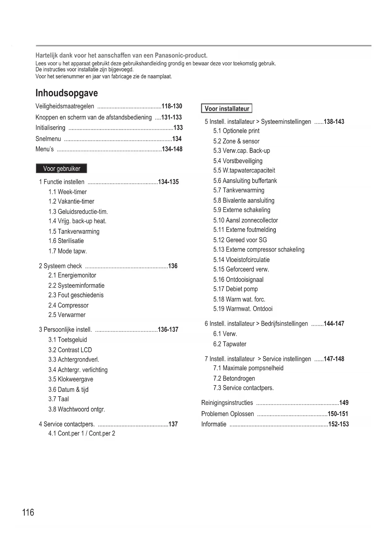 Reinigingsinstructies .....................................................149 Problemen Oplossen .............................................150-151 Informatie ...............................................................152-153 Hartelijk dank voor het aanschaffen van een Panasonic-product. Lees voor u het apparaat gebruikt deze gebruikshandleiding grondig en bewaar deze voor toekomstig gebruik. De instructies voor installatie zijn bijgevoegd. Voor het serienummer en jaar van fabricage zie de naamplaat.Zorg ervoor dat het systeem juist is geïnstalleerd door een erkende dealer volgens de verstrekte instructies, voordat u het gaat gebruiken.