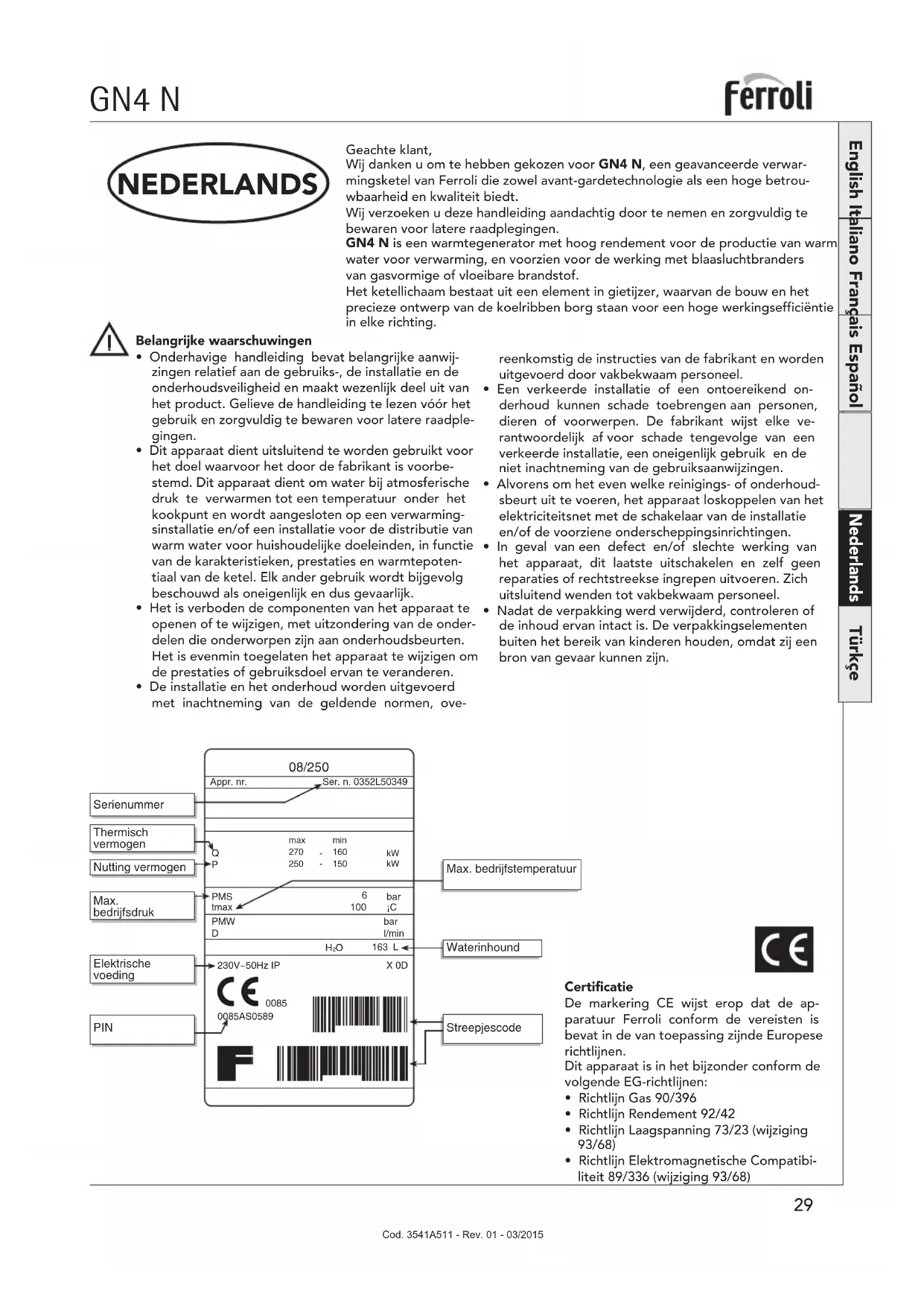Para colocar por el SAT el código de barras contenido en la documentación del producto Certificado de funcionamiento Llene por favor la cupón unida29 English Italiano Français Español Nederlands Türkçe GN4 N Cod. 3541A511 - Rev. 01 - 03/2015 Geachte klant, Wij danken u om te hebben gekozen voor GN4 N, een geavanceerde verwar- mingsketel van Ferroli die zowel avant-gardetechnologie als een hoge betrou- wbaarheid en kwaliteit biedt. Wij verzoeken u deze handleiding aandachtig door te nemen en zorgvuldig te bewaren voor latere raadplegingen. GN4 N is een warmtegenerator met hoog rendement voor de productie van warm water voor verwarming, en voorzien voor de werking met blaasluchtbranders van gasvormige of vloeibare brandstof. Het ketellichaam bestaat uit een element in gietijzer, waarvan de bouw en het precieze ontwerp van de koelribben borg staan voor een hoge werkingsefficiëntie in elke richting. Belangrijke waarschuwingen