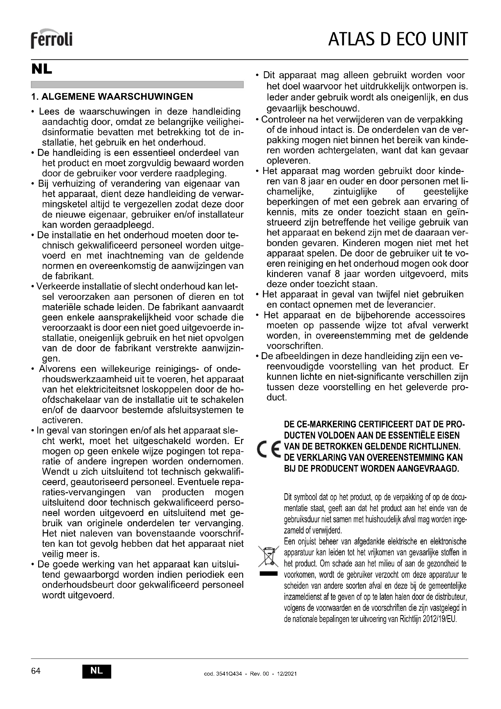BIJ DE PRODUCENT WORDEN AANGEVRAAGD. Dit symbool dat op het product, op de verpakking of op de docu- mentatie staat, geeft aan dat het product aan het einde van de gebruiksduur niet samen met huishoudelijk afval mag worden inge- zameld of verwijderd. Een onjuist beheer van afgedankte elektrische en elektronische apparatuur kan leiden tot het vrijkomen van gevaarlijke stoffen in het product. Om schade aan het milieu of aan de gezondheid te voorkomen, wordt de gebruiker verzocht om deze apparatuur te scheiden van andere soorten afval en deze bij de gemeentelijke inzameldienst af te geven of op te laten halen door de distributeur, volgens de voorwaarden en de voorschriften die zijn vastgelegd in de nationale bepalingen ter uitvoering van Richtlijn 2012/19/EU.ATLAS D ECO UNIT