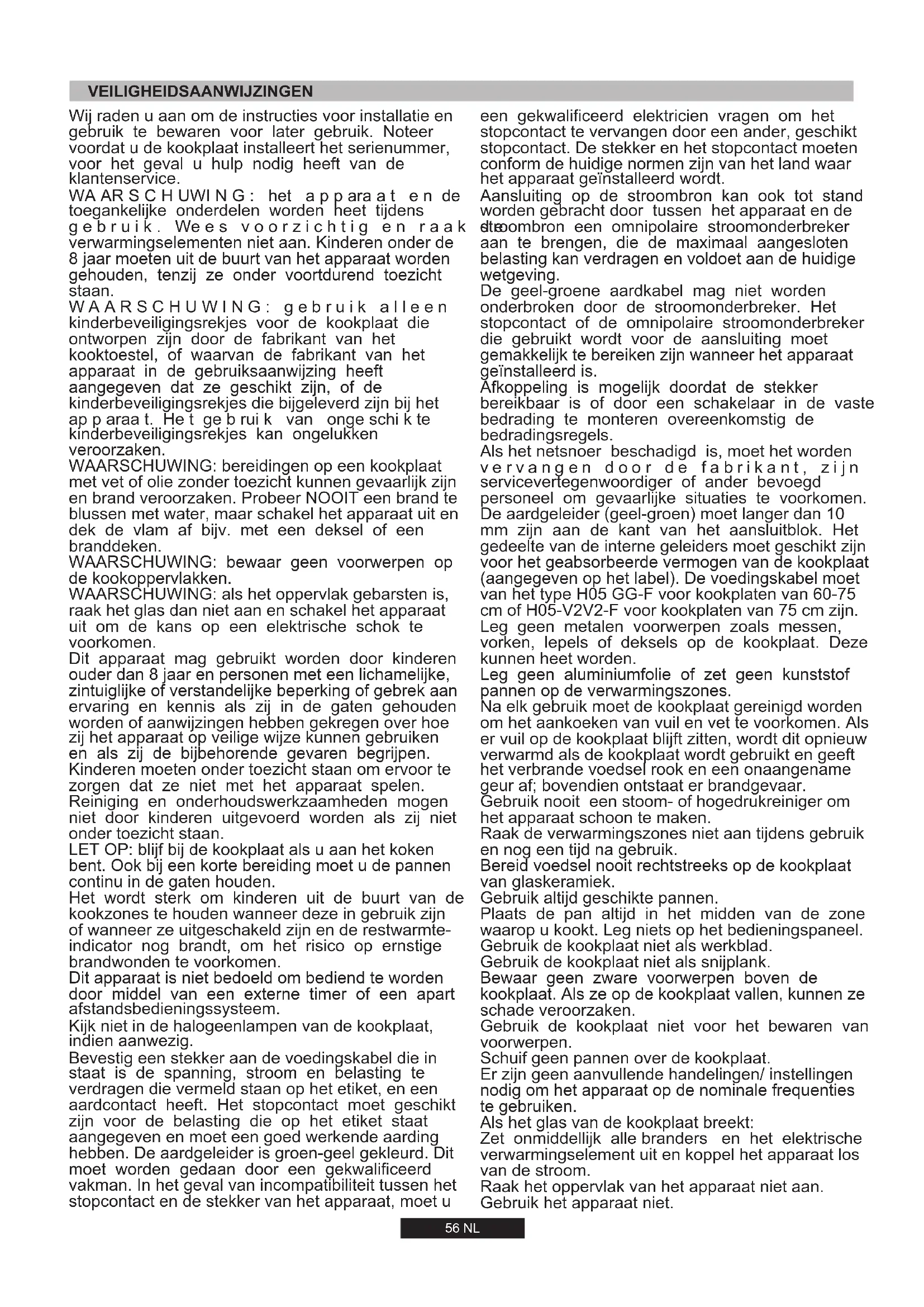 flexibel staal. Belangrijk: controleer nadat u alle installatie handelingen heeft verricht de aansluitpunten op een goede afsluiting. Gebruik hiervoor een zeepsopje. Nooit een vlam. Controleer ook of de flexibele slang niet in aanraking komt met bewegende delen van de keukenmeubelen zoals een lade zodat de slang wordt beschadigd. Let op: als u een gasgeur ruikt die uit het toestel lijkt te komen, schakel dan onmiddellijk de gastoevoer dicht en bel een gekwalificeerde persoon. Ga niet op zoek naar een lek met een vlam. Het aansluiten van het apparaat op het gasnet of gasflessen dient te gebeuren volgens de wettelijk geldende voorschriften. De aarde-draad (groen en geel van kleur) moet ten minste 10 mm langer zijn dan de beide andere draden. De doorsnee van de kabel moet in een goede verhouding staan tot de maximale aansluitwaarde van de kookplaat. Zie voor de netspanningsgegevens het typeplaatje op de kookplaat en controleer of het nieuwe netsnoer van het type H05 GG-F voor kookplaten van 60-75 cm of H05-V2V2-F voor kookplaten van 75 cm is. Wanneer die voedingskabel beschadigd is, dient deze vervangen te worden door een erkende reparateur, om onnodige risico's te vermijden. In het onwaarschijnlijke geval dat een scheur zou verschijnen op het glas, haal onmiddellijk de stekker uit het contact en neem contact op met de klantenservice. Het apparaat is niet bedoeld voor gebruik met een externe timer of afstandsbediening.
