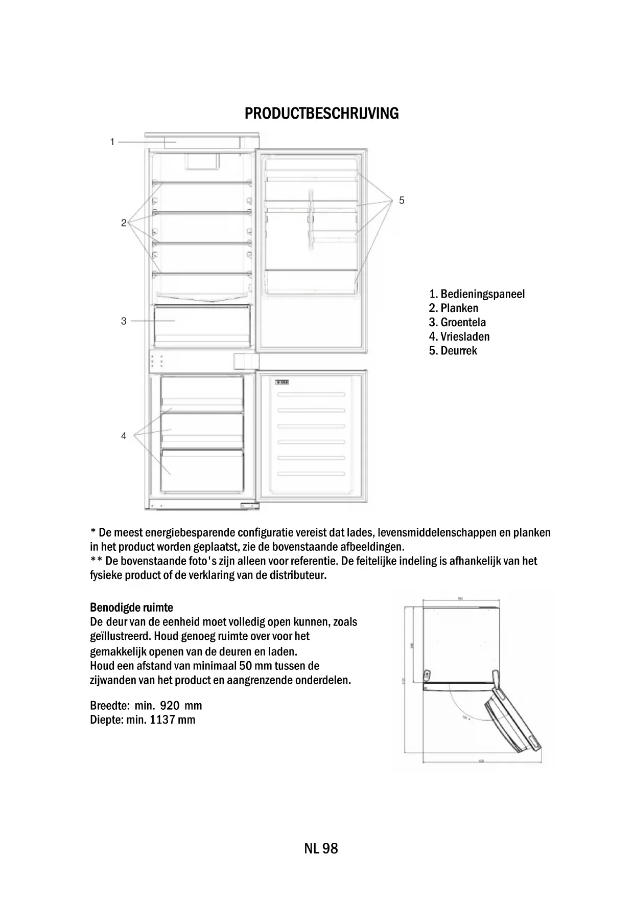 Benodigde ruimte De deur van de eenheid moet volledig open kunnen, zoals geïllustreerd. Houd genoeg ruimte over voor het gemakkelijk openen van de deuren en laden. Houd een afstand van minimaal 50 mm tussen de zijwanden van het product en aangrenzende onderdelen. Breedte: min. 920 mm Diepte: min. 1137 mmNL 99 GEBRUIK A. Aan/uit-toets, gebruikt om het apparaat aan/uit te zetten.B. Wifitoets, gebruikt om de wifi in/uit te schakelenC. SET-toets, gebruikt om de speciale functies (Eco en vakantie) te selecterenD. TEMP-toets, gebruikt om de koelkast- en vriezertemperatuur te selecterena. Pictogram voor koelkast-/vriezergedeelte, geeft aan welke ruimte van het apparaat is geselecteerdb. Temperatuurniveaus van de koelkast, geven aan wat de geselecteerd temperatuur isc. Pictogram voor superkoelen, geeft aan of de superkoelfunctie geactiveerd isd. Temperatuurniveaus van de vriezer, geven aan wat de geselecteerde temperatuur ise. Pictogram voor supervriezen, geeft aan of de supervriesfunctie geactiveerd isf. Pictogram aangepaste temperatuur, geeft aan of de temperatuur vanuit de app is geselecteerdg. Eco-moduspictogram, geeft aan of de Eco-modus geactiveerd ish. Vakantiefunctiepictogram, geeft aan of de vakantiefunctie geactiveerd isi. Wifipictogram, geeft aan of de wifi werkt en het apparaat verbonden is Gebruik