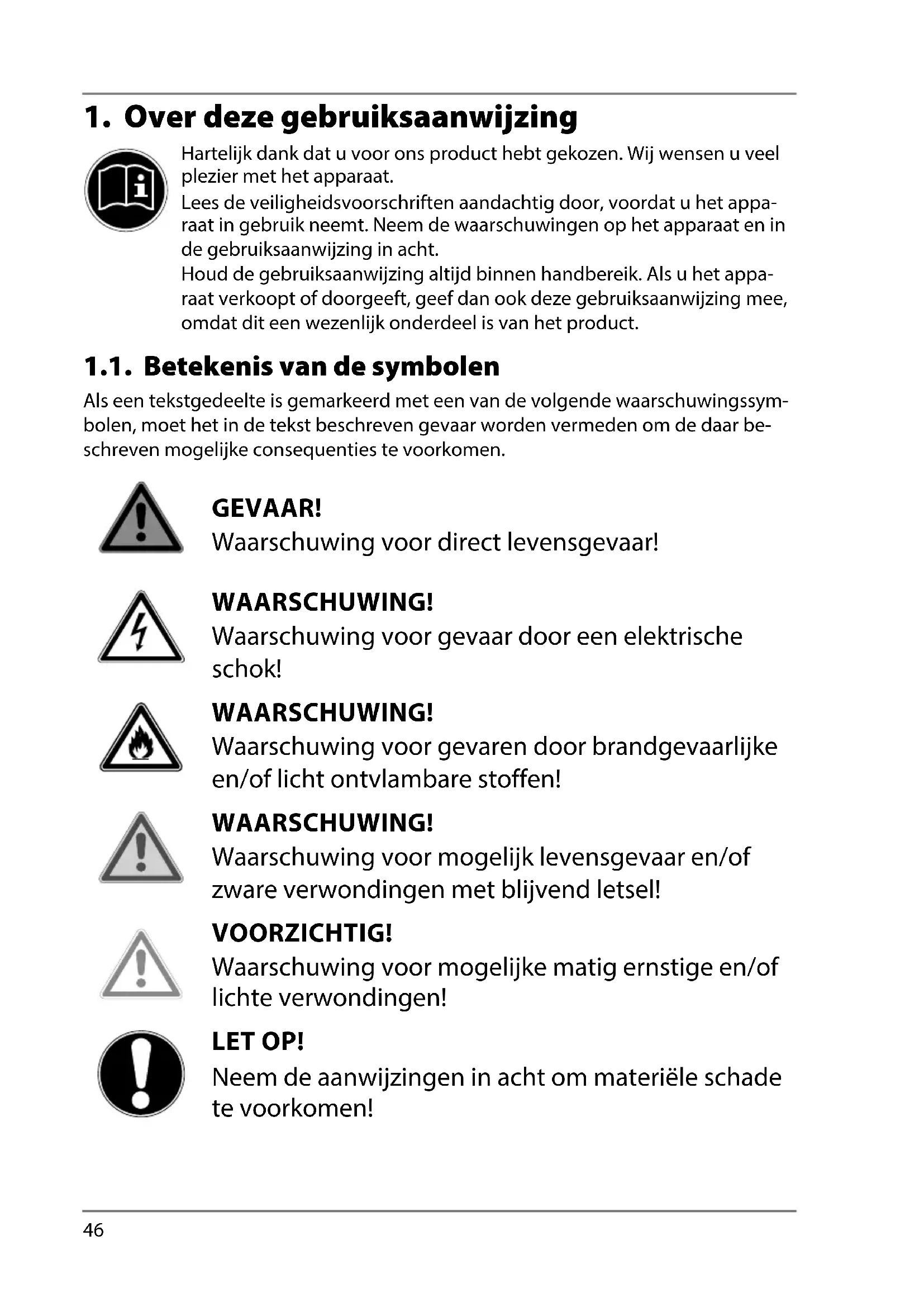Hartelijk dank dat u voor ons product hebt gekozen. Wij wensen u veel plezier met het apparaat. Lees de veiligheidsvoorschriften aandachtig door, voordat u het appa- raat in gebruik neemt. Neem de waarschuwingen op het apparaat en in de gebruiksaanwijzing in acht. Houd de gebruiksaanwijzing altijd binnen handbereik. Als u het appa- raat verkoopt of doorgeeft, geef dan ook deze gebruiksaanwijzing mee, omdat dit een wezenlijk onderdeel is van het product. 1.1. Betekenis van de symbolen Als een tekstgedeelte is gemarkeerd met een van de volgende waarschuwingssym- bolen, moet het in de tekst beschreven gevaar worden vermeden om de daar be- schreven mogelijke consequenties te voorkomen. GEVAAR! Waarschuwing voor direct levensgevaar! WAARSCHUWING! Waarschuwing voor gevaar door een elektrische schok! WAARSCHUWING! Waarschuwing voor gevaren door brandgevaarlijke en/of licht ontvlambare stoffen! WAARSCHUWING! Waarschuwing voor mogelijk levensgevaar en/of zware verwondingen met blijvend letsel! VOORZICHTIG! Waarschuwing voor mogelijke matig ernstige en/of lichte verwondingen! LET OP! Neem de aanwijzingen in acht om materiële schade te voorkomen!47