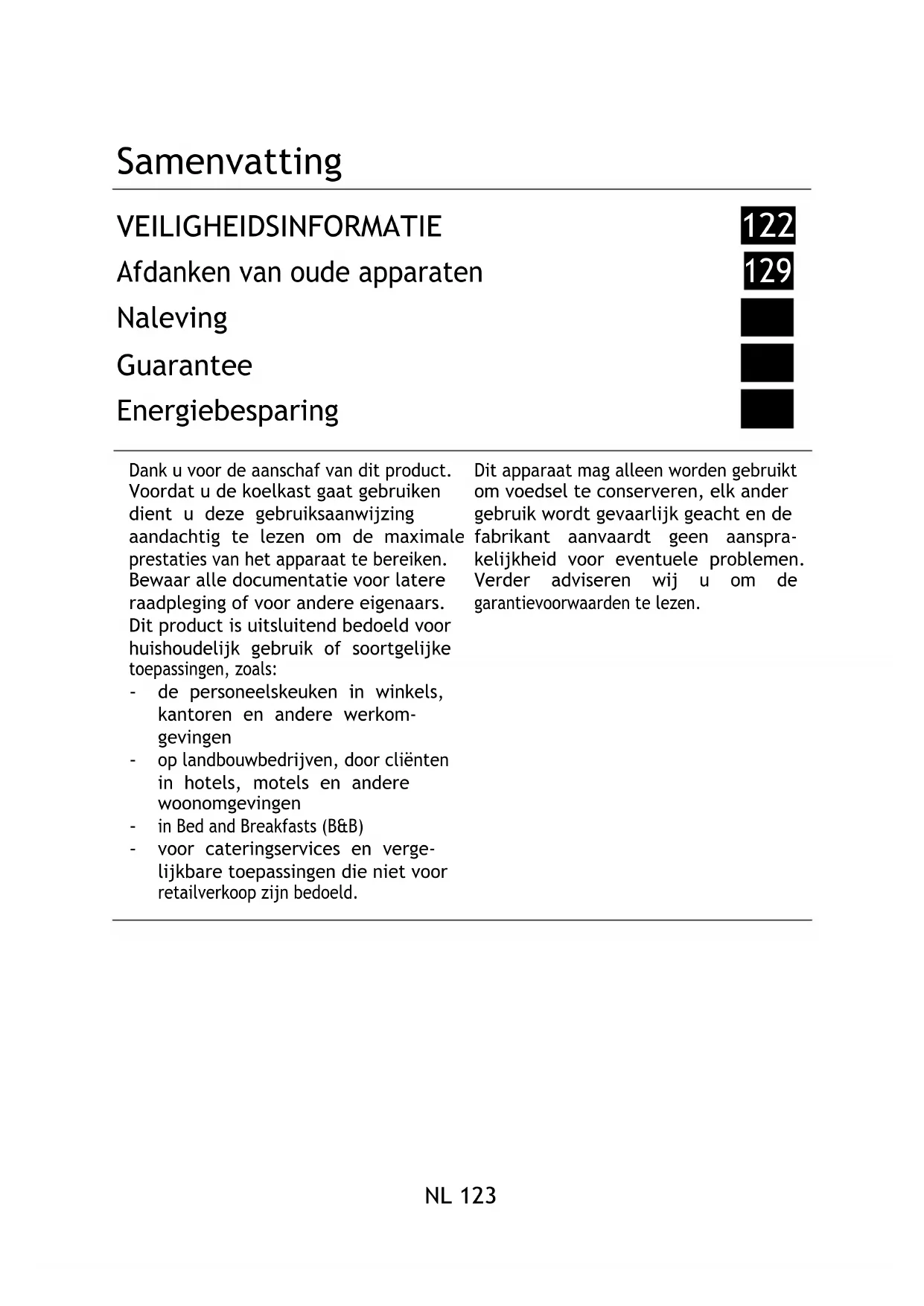 Naleving 129 Guarantee 129 Energiebesparing 130 Dank u voor de aanschaf van dit product. Voordat u de koelkast gaat gebruiken dient u deze gebruiksaanwijzing aandachtig te lezen om de maximale prestaties van het apparaat te bereiken. Bewaar alle documentatie voor latere raadpleging of voor andere eigenaars. Dit product is uitsluitend bedoeld voor huishoudelijk gebruik of soortgelijke toepassingen, zoals: