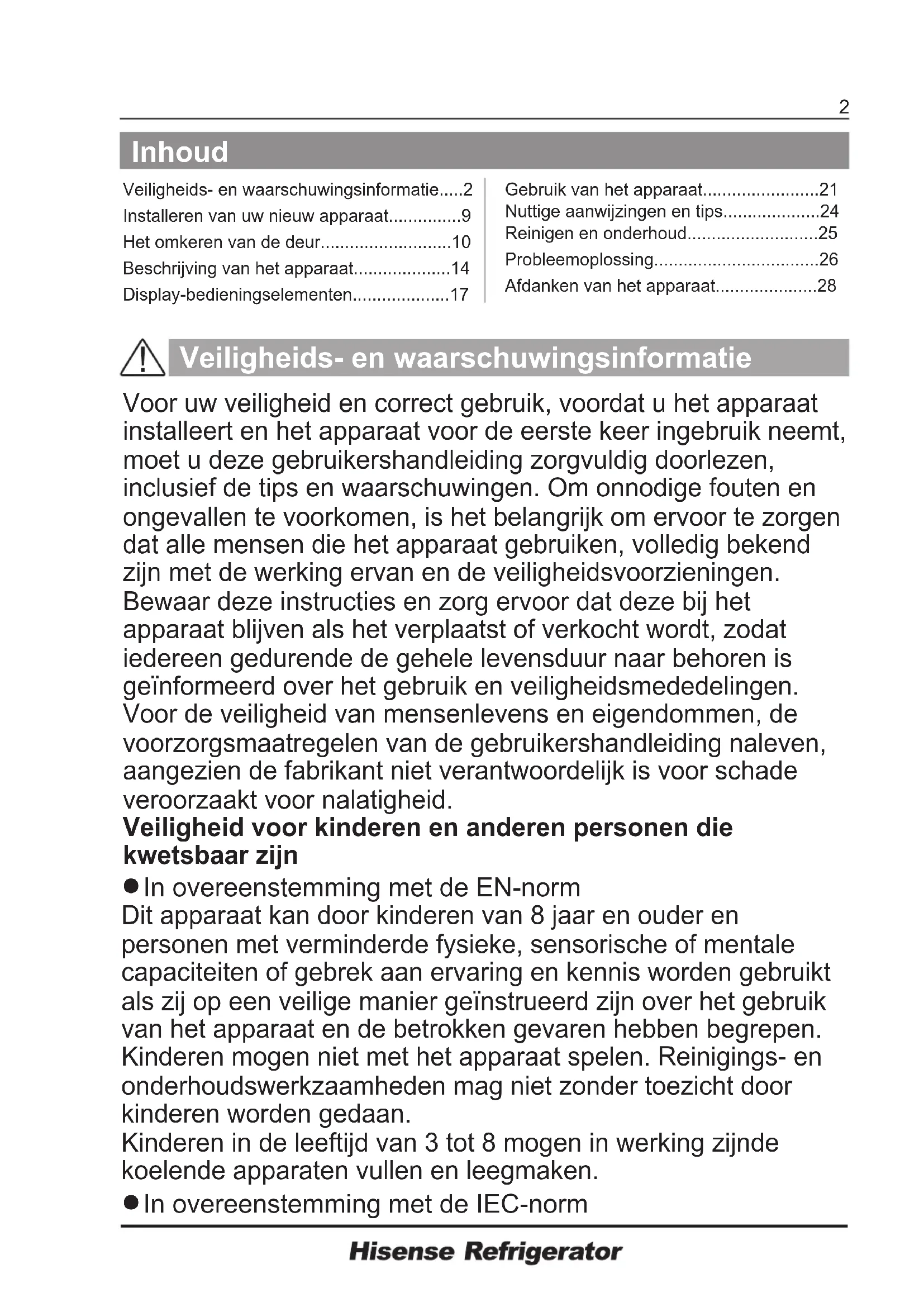 In overeenstemming met de IEC-norm3 Dit apparaat is niet bedoeld voor gebruik door personen (inclusief kinderen) met verminderde lichamelijke, zintuiglijke of geestelijke vermogens, of gebrek aan ervaring en kennis, tenzij ze onder toezicht staan of geïnstrueerd werden over het gebruik van het apparaat door een persoon die verantwoordelijk is voor hun veiligheid. ● Kinderen moeten onder toezicht staan om ervoor te zorgen dat ze niet met het apparaat spelen. ● Houd alle verpakkingsmaterialen uit de buurt van kinderen, omdat er verstikkingsgevaar bestaat. ● Indien u het apparaat gaat afdanken, trekt u de stekker uit het stopcontact, snijdt het netsnoer ervan af (zo dicht mogelijk bij het apparaat) en verwijder de deur, teneinde te voorkomen dat kinderen een elektrische schokken krijgen of zichzelf in het apparaat opsluiten. ● Indien dit apparaat, welke is voorzien van magnetische deurafdichtingen, een ouder model van het apparaat moet vervangen die een veerslot (vergrendeling) op de deur of de deksel heeft, zorg ervoor dat het veerslot onbruikbaar wordt gemaakt voordat u het oude apparaat afdankt. Het bovenstaande zal voorkomen dat het een dodelijke valstrik voor een kind wordt.