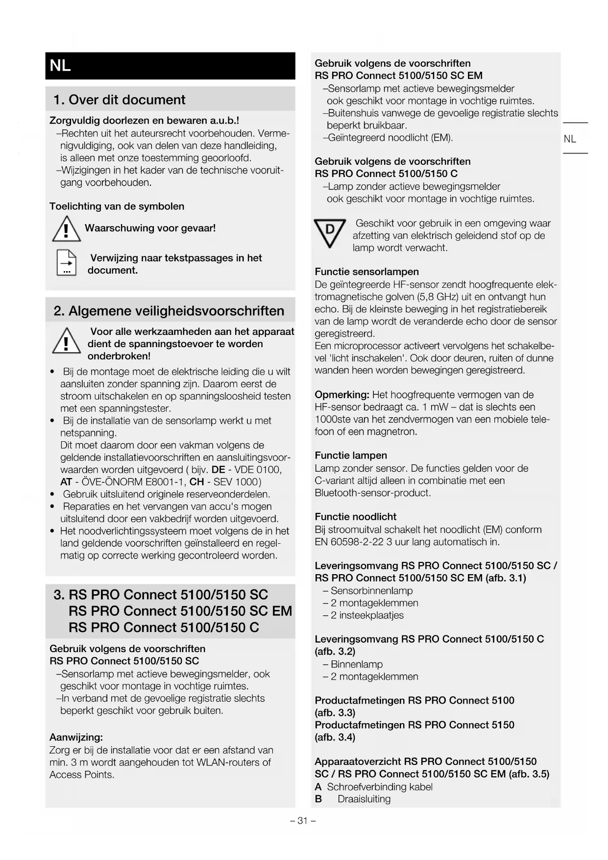 RS PRO Connect 5100/5150 SC EM RS PRO Connect 5100/5150 C Gebruik volgens de voorschriften RS PRO Connect 5100/5150 SC – Sensorlamp met actieve bewegingsmelder, ook geschikt voor montage in vochtige ruimtes. – In verband met de gevoelige registratie slechts beperkt geschikt voor gebruik buiten. Aanwijzing: Zorg er bij de installatie voor dat er een afstand van min. 3 m wordt aangehouden tot WLAN-routers of Access Points. Gebruik volgens de voorschriften RS PRO Connect 5100/5150 SC EM – Sensorlamp met actieve bewegingsmelder ook geschikt voor montage in vochtige ruimtes. – Buitenshuis vanwege de gevoelige registratie slechts beperkt bruikbaar. – Geïntegreerd noodlicht (EM). Gebruik volgens de voorschriften RS PRO Connect 5100/5150 C – Lamp zonder actieve bewegingsmelder ook geschikt voor montage in vochtige ruimtes. Geschikt voor gebruik in een omgeving waar afzetting van elektrisch geleidend stof op de lamp wordt verwacht. Functie sensorlampen De geïntegreerde HF-sensor zendt hoogfrequente elek- tromagnetische golven (5,8 GHz) uit en ontvangt hun echo. Bij de kleinste beweging in het registratiebereik van de lamp wordt de veranderde echo door de sensor geregistreerd. Een microprocessor activeert vervolgens het schakelbe- vel 'licht inschakelen'. Ook door deuren, ruiten of dunne wanden heen worden bewegingen geregistreerd. Opmerking: Het hoogfrequente vermogen van de HF-sensor bedraagt ca. 1 mW – dat is slechts een 1000ste van het zendvermogen van een mobiele tele- foon of een magnetron. Functie lampen Lamp zonder sensor. De functies gelden voor de C-variant altijd alleen in combinatie met een Bluetooth-sensor-product. Functie noodlicht Bij stroomuitval schakelt het noodlicht (EM) conform EN 60598-2-22 3uur lang automatisch in. Leveringsomvang RS PRO Connect 5100/5150 SC / RS PRO Connect 5100/5150 SC EM (afb.3.1) – Sensorbinnenlamp – 2 montageklemmen – 2 insteekplaatjes Leveringsomvang RS PRO Connect 5100/5150 C (afb.3.2) – Binnenlamp – 2 montageklemmen Productafmetingen RS PRO Connect 5100 (afb.3.3) Productafmetingen RS PRO Connect 5150 (afb.3.4) Apparaatoverzicht RS PRO Connect 5100/5150 SC / RS PRO Connect 5100/5150 SC EM (afb.3.5) A Schroefverbinding kabel B Draaisluiting NL– 32 – C Aansluitklem D Montageklem E Eindkapjes F Lampbehuizing G HF-sensor H Afdekplaat Apparaatoverzicht RS PRO Connect 5100/5150 C (afb.3.6) A Kabelwartel B Draaisluiting C Aansluitklem D Montageklem E Eindkappen F Lampbehuizing Registratiebereiken plafondmontage Ø 1-10m (afb.3.7) Registratiebereik wandmontage Ø 1-10m (afb.3.8) Lichtsterkteverdeling (afb.3.9 - 3.14)